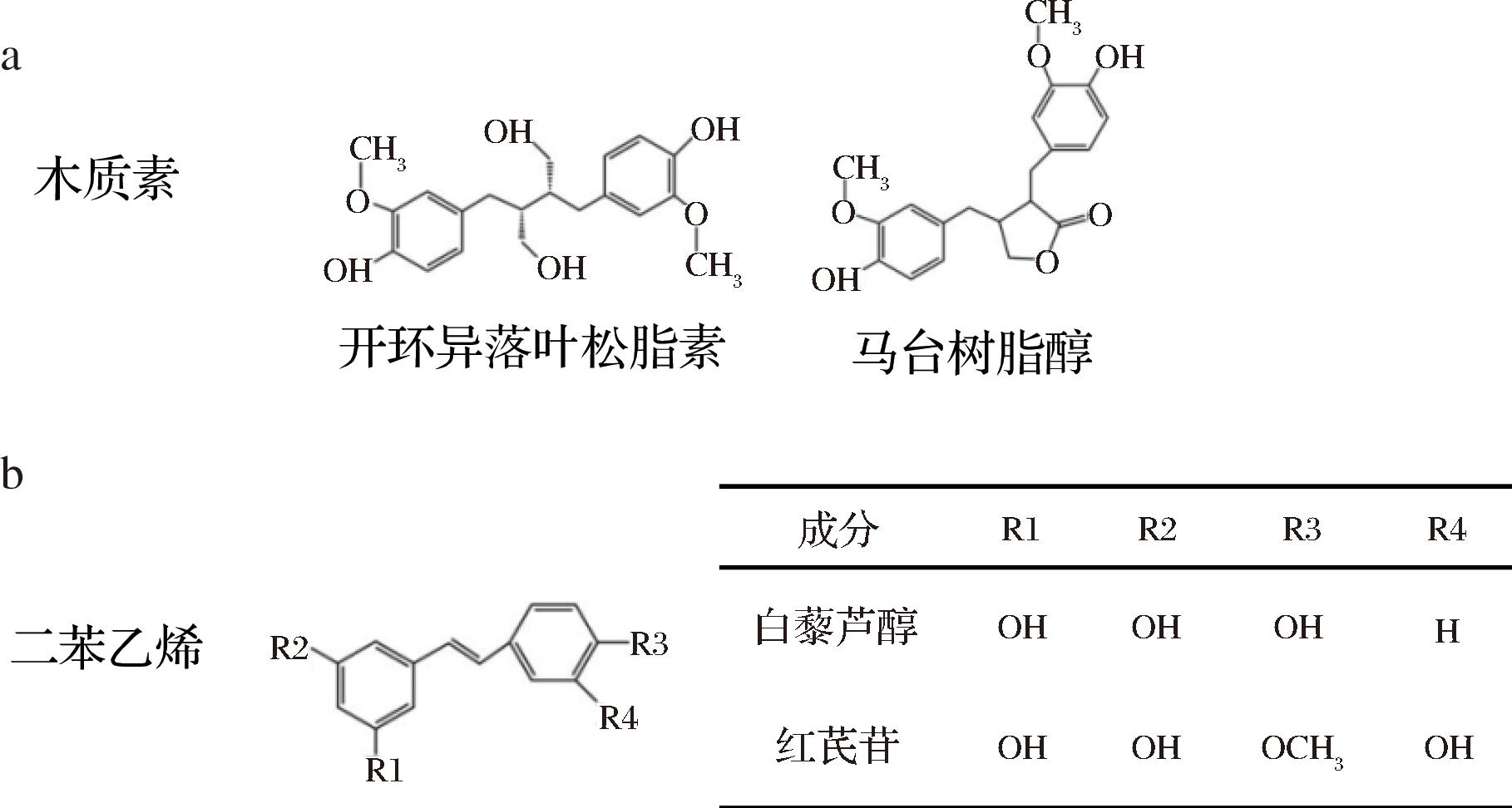 图3 木质素和二苯乙烯类物质的成分结构
