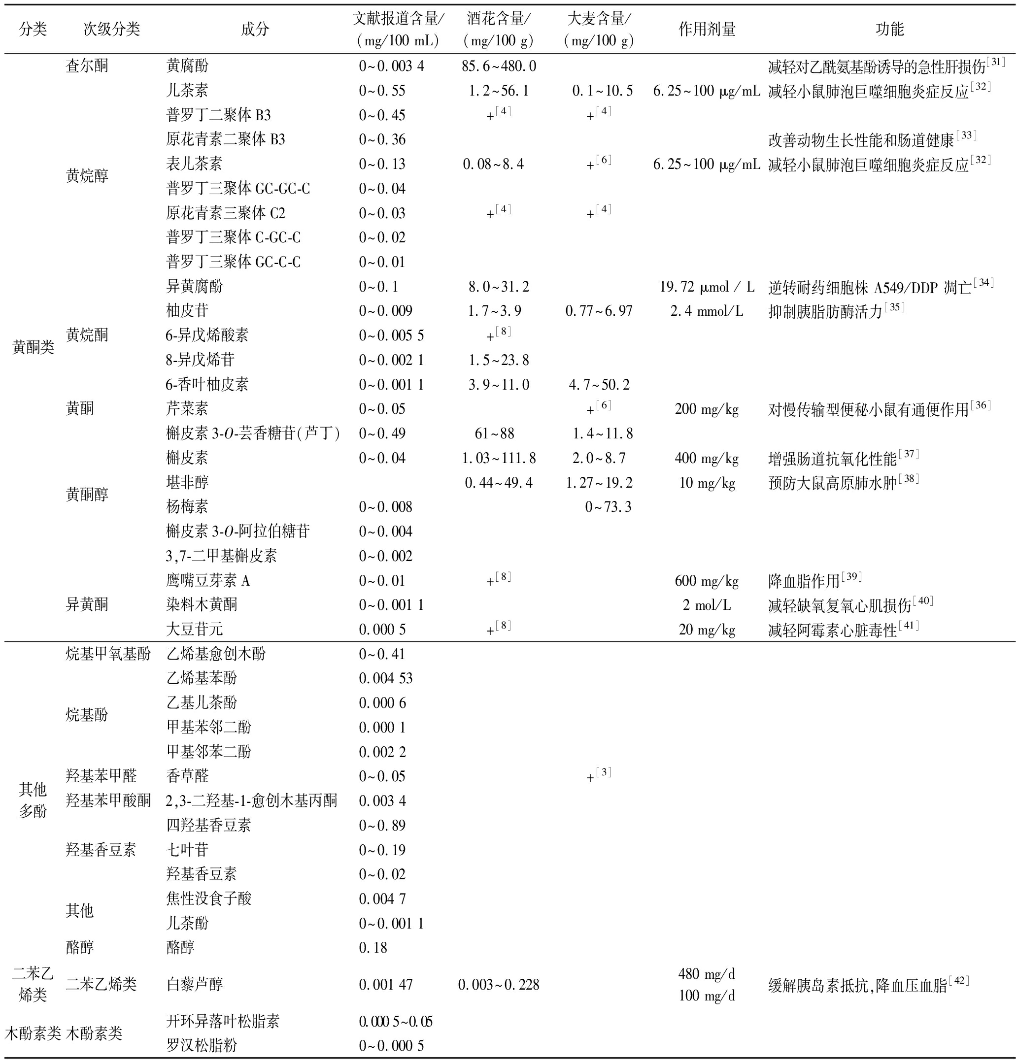 分类次级分类成分文献报道含量/(mg/100 mL)酒花含量/(mg/100 g)大麦含量/(mg/100 g)作用剂量功能黄酮类查尔酮黄烷醇黄烷酮黄酮黄酮醇异黄酮黄腐酚0~0.003 485.6~480.0减轻对乙酰氨基酚诱导的急性肝损伤[31]儿茶素0~0.551.2~56.1 0.1~10.56.25~100 μg/mL减轻小鼠肺泡巨噬细胞炎症反应[32]普罗丁二聚体B30~0.45+[4]+[4]原花青素二聚体B30~0.36改善动物生长性能和肠道健康[33]表儿茶素0~0.130.08~8.4 +[6]6.25~100 μg/mL减轻小鼠肺泡巨噬细胞炎症反应[32]普罗丁三聚体GC-GC-C0~0.04原花青素三聚体C20~0.03+[4]+[4]普罗丁三聚体C-GC-C0~0.02普罗丁三聚体GC-C-C0~0.01异黄腐酚0~0.18.0~31.219.72 μmol / L逆转耐药细胞株 A549/DDP 凋亡[34]柚皮苷0~0.0091.7~3.9 0.77~6.972.4 mmol/L抑制胰脂肪酶活力[35]6-异戊烯酸素0~0.005 5+[8]8-异戊烯苷0~0.002 11.5~23.86-香叶柚皮素0~0.001 13.9~11.04.7~50.2芹菜素0~0.05+[6]200 mg/kg对慢传输型便秘小鼠有通便作用[36]槲皮素3-O-芸香糖苷(芦丁)0~0.4961~88 1.4~11.8槲皮素0~0.041.03~111.82.0~8.7400 mg/kg增强肠道抗氧化性能[37]堪非醇0.44~49.41.27~19.210 mg/kg预防大鼠高原肺水肿[38]杨梅素0~0.008 0~73.3槲皮素3-O-阿拉伯糖苷0~0.0043,7-二甲基槲皮素0~0.002鹰嘴豆芽素A0~0.01+[8]600 mg/kg降血脂作用[39]染料木黄酮0~0.001 12 mol/L减轻缺氧复氧心肌损伤[40]大豆苷元0.000 5+[8]20 mg/kg减轻阿霉素心脏毒性[41]其他多酚烷基甲氧基酚烷基酚羟基苯甲醛羟基苯甲酸酮羟基香豆素其他酪醇乙烯基愈创木酚0~0.41乙烯基苯酚0.004 53乙基儿茶酚0.000 6甲基苯邻二酚0.000 1甲基邻苯二酚0.002 2香草醛0~0.05+[3]2,3-二羟基-1-愈创木基丙酮0.003 4四羟基香豆素0~0.89七叶苷0~0.19羟基香豆素0~0.02焦性没食子酸0.004 7儿茶酚0~0.001 1酪醇0.18二苯乙烯类二苯乙烯类白藜芦醇0.001 470.003~0.228480 mg/d100 mg/d缓解胰岛素抵抗,降血压血脂[42]木酚素类木酚素类开环异落叶松脂素0.000 5~0.05罗汉松脂粉0~0.000 5