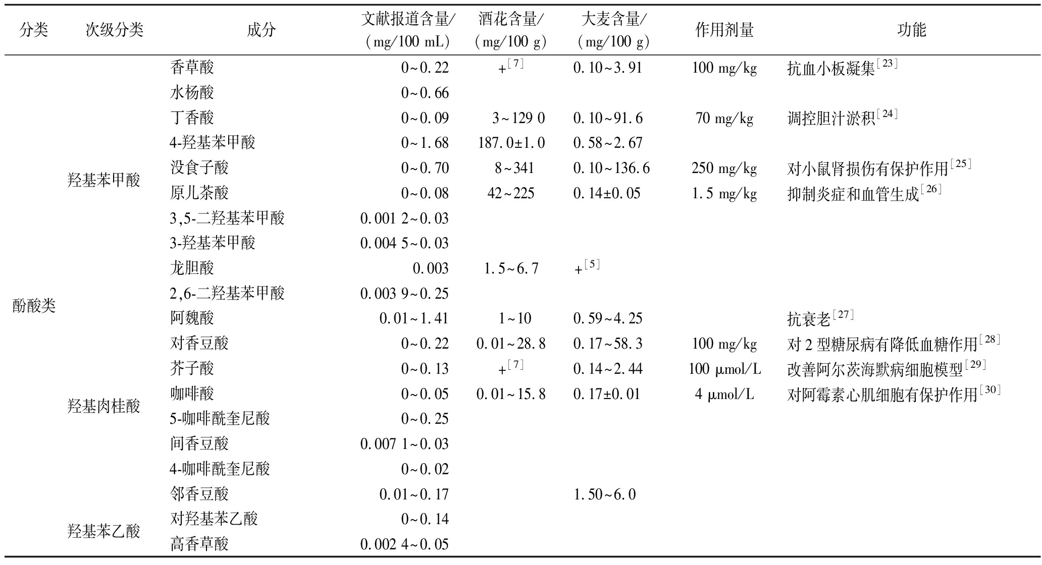 分类次级分类成分文献报道含量/(mg/100 mL)酒花含量/(mg/100 g)大麦含量/(mg/100 g)作用剂量功能酚酸类羟基苯甲酸羟基肉桂酸羟基苯乙酸香草酸0~0.22+[7]0.10~3.91100 mg/kg抗血小板凝集[23]水杨酸0~0.66丁香酸0~0.09 3~129 00.10~91.670 mg/kg调控胆汁淤积[24]4-羟基苯甲酸0~1.68187.0±1.00.58~2.67没食子酸0~0.70 8~3410.10~136.6250 mg/kg对小鼠肾损伤有保护作用[25]原儿茶酸0~0.0842~2250.14±0.051.5 mg/kg抑制炎症和血管生成[26]3,5-二羟基苯甲酸0.001 2~0.033-羟基苯甲酸0.004 5~0.03龙胆酸0.0031.5~6.7+[5]2,6-二羟基苯甲酸0.003 9~0.25阿魏酸0.01~1.41 1~100.59~4.25抗衰老[27]对香豆酸0~0.220.01~28.80.17~58.3100 mg/kg对2型糖尿病有降低血糖作用[28]芥子酸0~0.13+[7]0.14~2.44100 μmol/L改善阿尔茨海默病细胞模型[29]咖啡酸0~0.050.01~15.80.17±0.014 μmol/L对阿霉素心肌细胞有保护作用[30]5-咖啡酰奎尼酸0~0.25间香豆酸0.007 1~0.034-咖啡酰奎尼酸0~0.02邻香豆酸0.01~0.171.50~6.0对羟基苯乙酸0~0.14高香草酸0.002 4~0.05