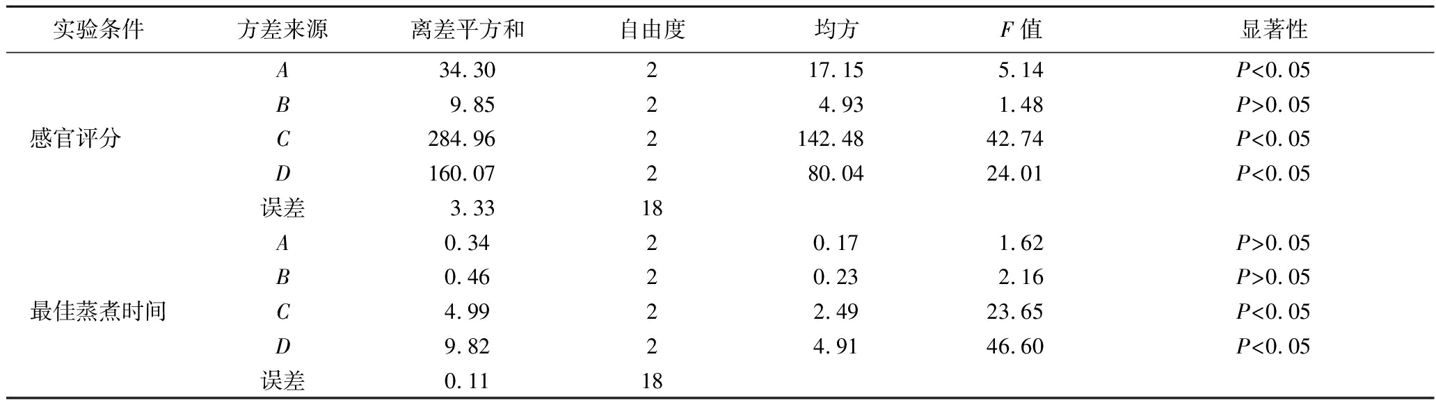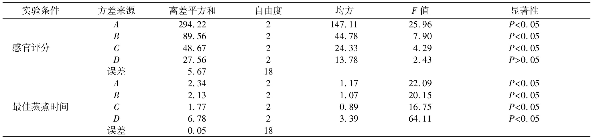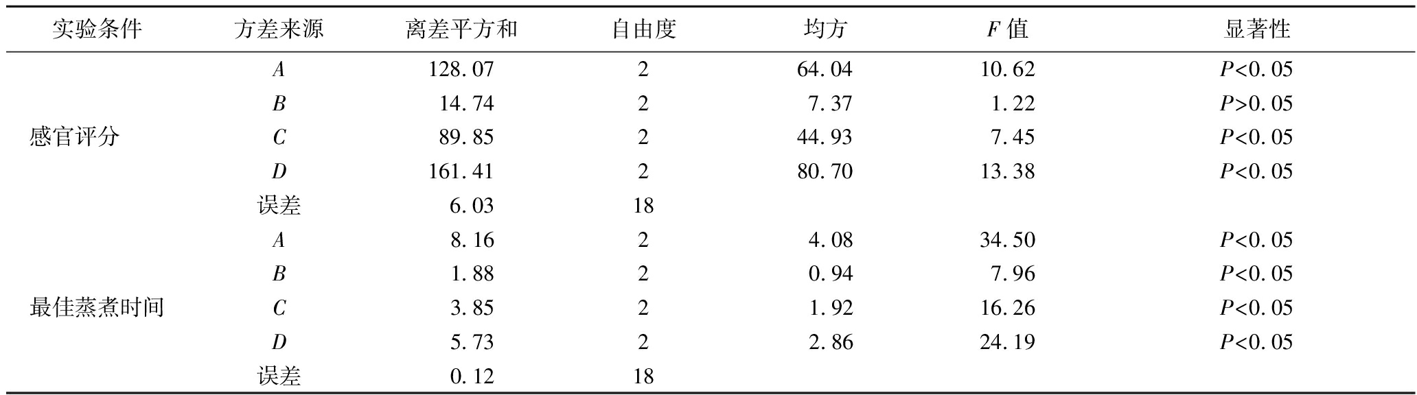 实验条件方差来源离差平方和自由度均方F值显著性感官评分 A128.07 264.04 10.62 P<0.05B14.74 27.37 1.22 P>0.05C89.85 244.93 7.45 P<0.05D161.41 280.70 13.38 P<0.05误差6.03 18最佳蒸煮时间A 8.16 2 4.08 34.50 P<0.05B1.88 20.94 7.96 P<0.05C3.85 21.92 16.26 P<0.05D5.73 22.86 24.19 P<0.05误差0.12 18