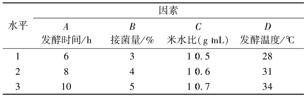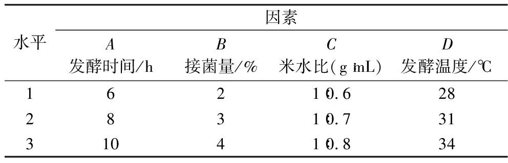 水平因素A发酵时间/hB接菌量/%C米水比(g∶mL)D发酵温度/℃1621∶0.6282831∶0.73131041∶0.834