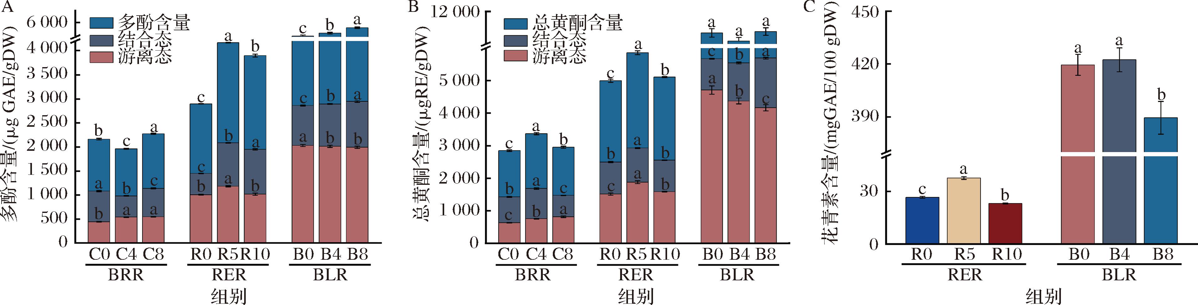 A-总酚含量(TPC);B-总黄酮含量(TFC);C-花青素含量(TAC)