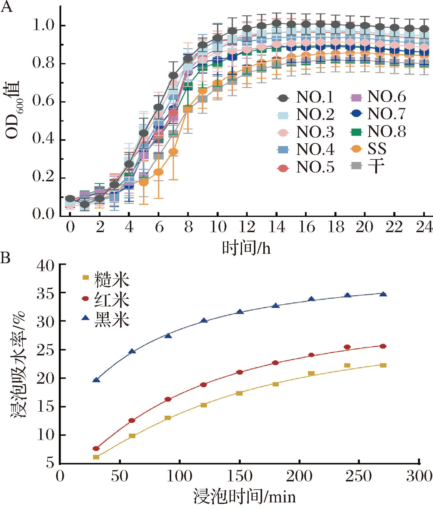 A-菌株的生长曲线;B-谷物浸泡吸水率