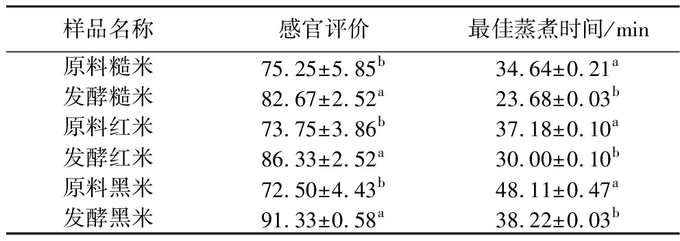 样品名称感官评价最佳蒸煮时间/min原料糙米75.25±5.85b34.64±0.21a发酵糙米82.67±2.52a23.68±0.03b原料红米73.75±3.86b37.18±0.10a发酵红米86.33±2.52a30.00±0.10b原料黑米72.50±4.43b48.11±0.47a发酵黑米91.33±0.58a38.22±0.03b