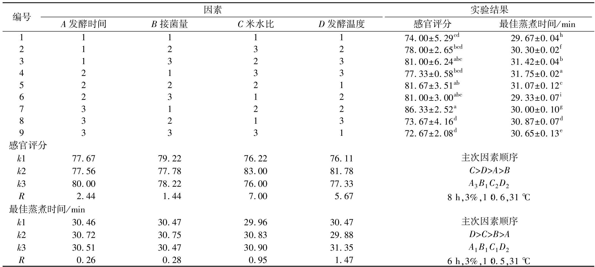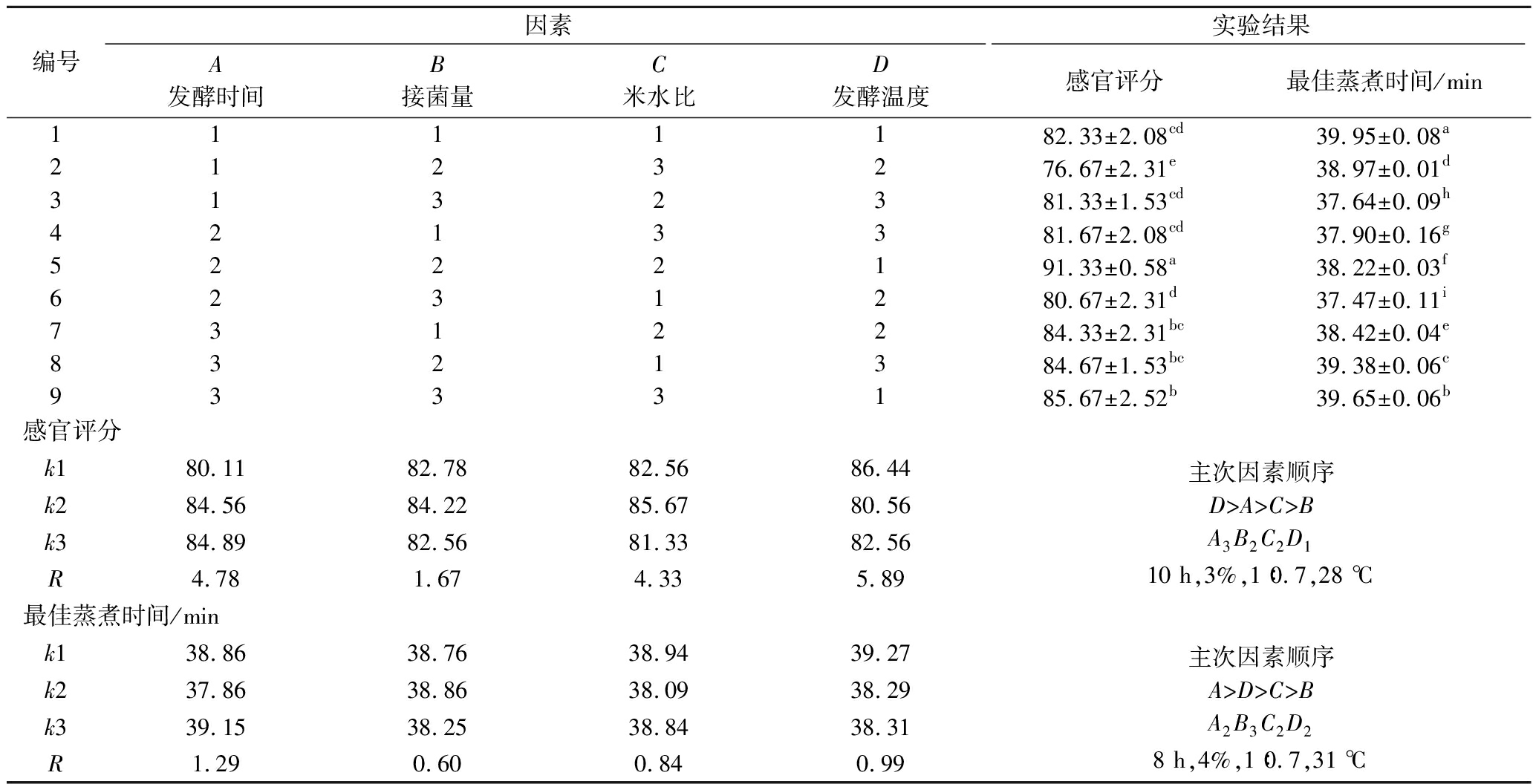 编号因素实验结果A发酵时间B接菌量C米水比D发酵温度感官评分最佳蒸煮时间/min1111172.33±2.52ef24.33±0.07c2123275.00±1.73def23.42±0.04f3132373.00±2.65cde24.85±0.03a4213380.67±3.51ab24.14±0.04d5222182.67±2.52a23.68±0.03e6231278.33±1.53abc22.84±0.07i7312277.67±3.06bcd23.00±0.07h8321374.67±0.58cde23.18±0.05g9333168.67±3.21f24.65±0.08b感官评分k173.4476.8975.1174.56k280.5677.4477.7877.00k373.6773.3374.7876.11R7.114.113.002.44主次因素顺序A>B>C>DA2B2C2D28 h,3%,1∶0.6,34 ℃最佳蒸煮时间/mink124.2023.8223.4523.09k223.5523.4323.8424.22k323.6124.1124.0724.06R0.650.690.621.14主次因素顺序D>B>A>CA2B2C1D18 h,3%,1∶0.5,31 ℃
