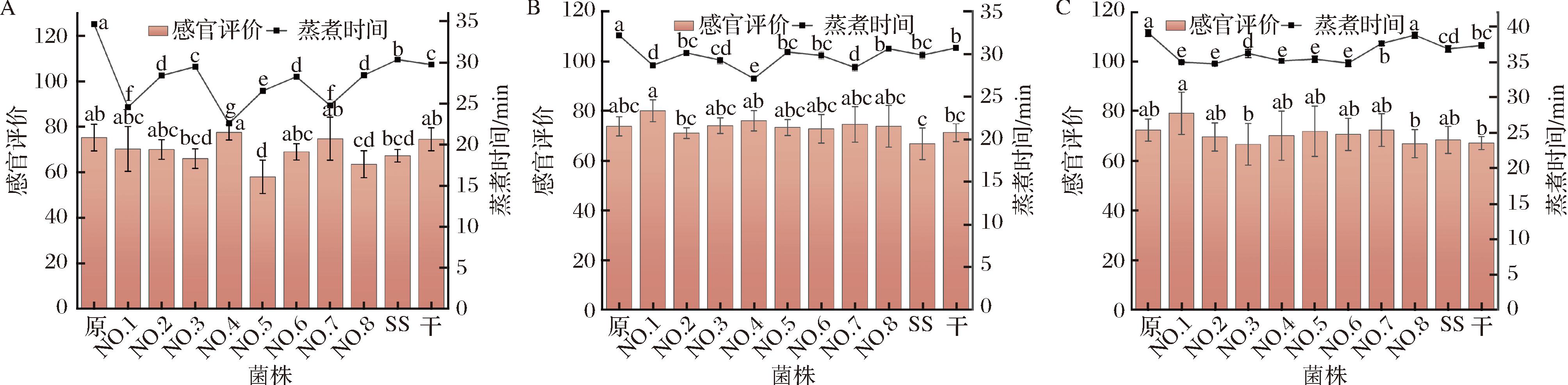 图2 不同菌株对谷物感官评价和最佳蒸煮时间的影响