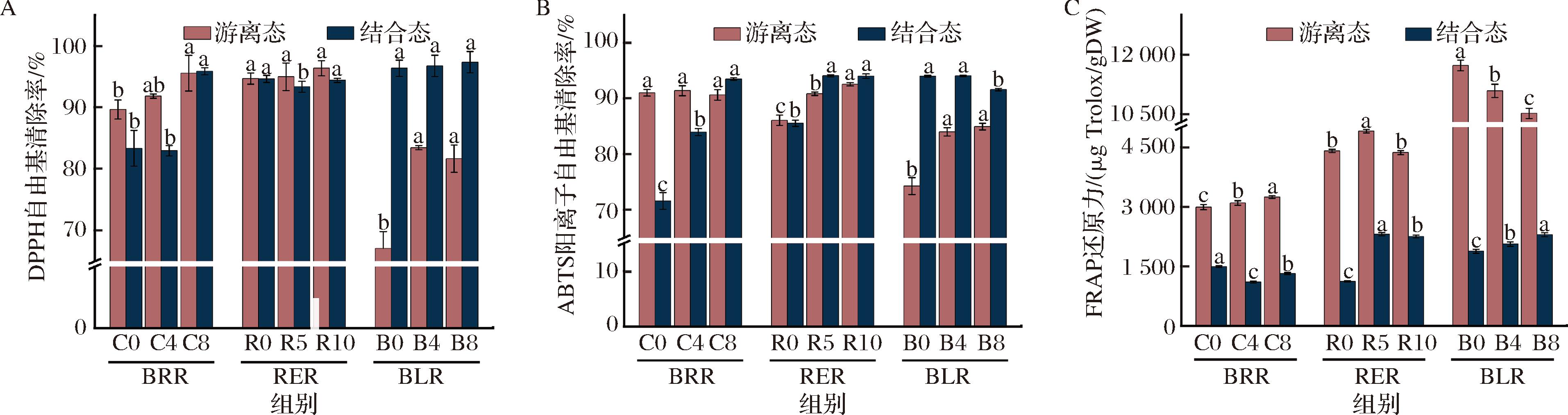 A-DPPH自由基清除能力;B-ABTS阳离子自由基清除能力;C-FRAP铁离子还原能力
