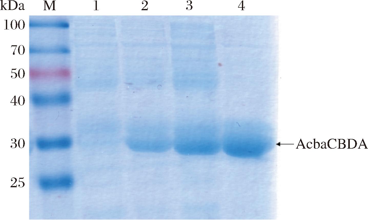 重组质粒pet30a(+)-AcbaCBDA成功被导入到E.coli BL21(DE3)中并成功被诱导表达。实验采用SDS-PAGE的技术对其分子质量及纯化后蛋白纯度进行检测,如图4所示。纯化后的AcbaCBDA蛋白条带单一,表观分子质量为29.6 kDa,与理论分子质量相符。