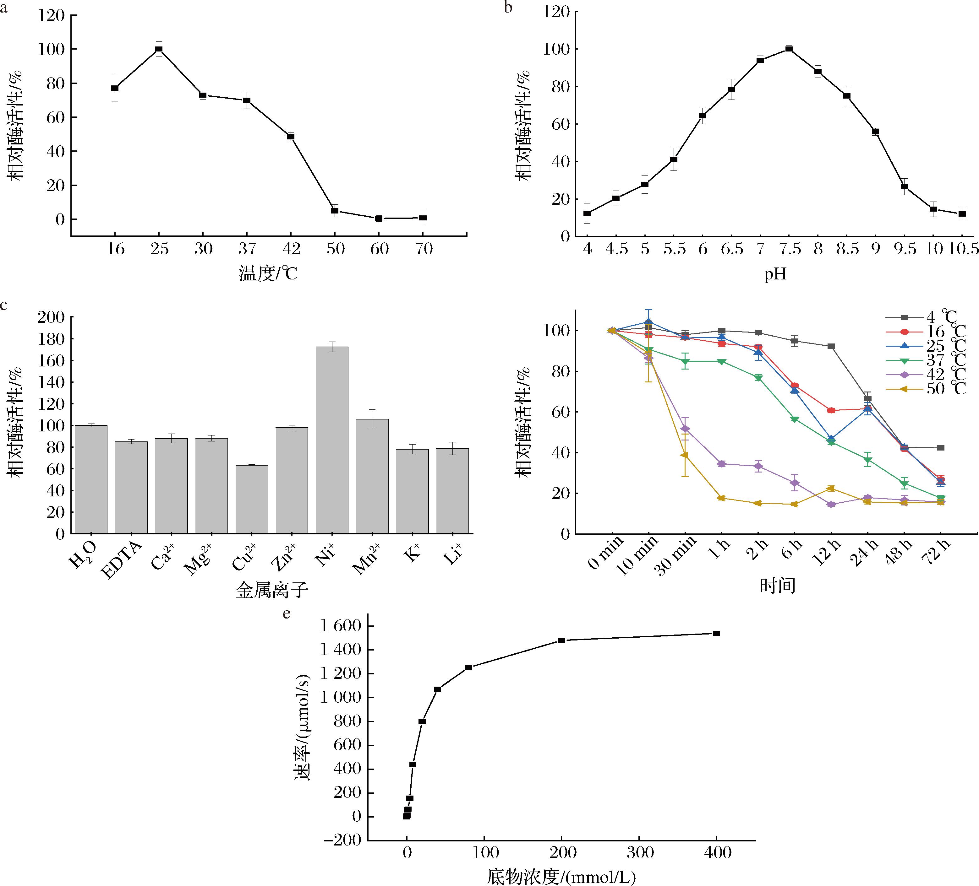 a-最适温度;b-最适pH;c-金属离子依赖性;d-温度稳定性;e-米氏方程曲线