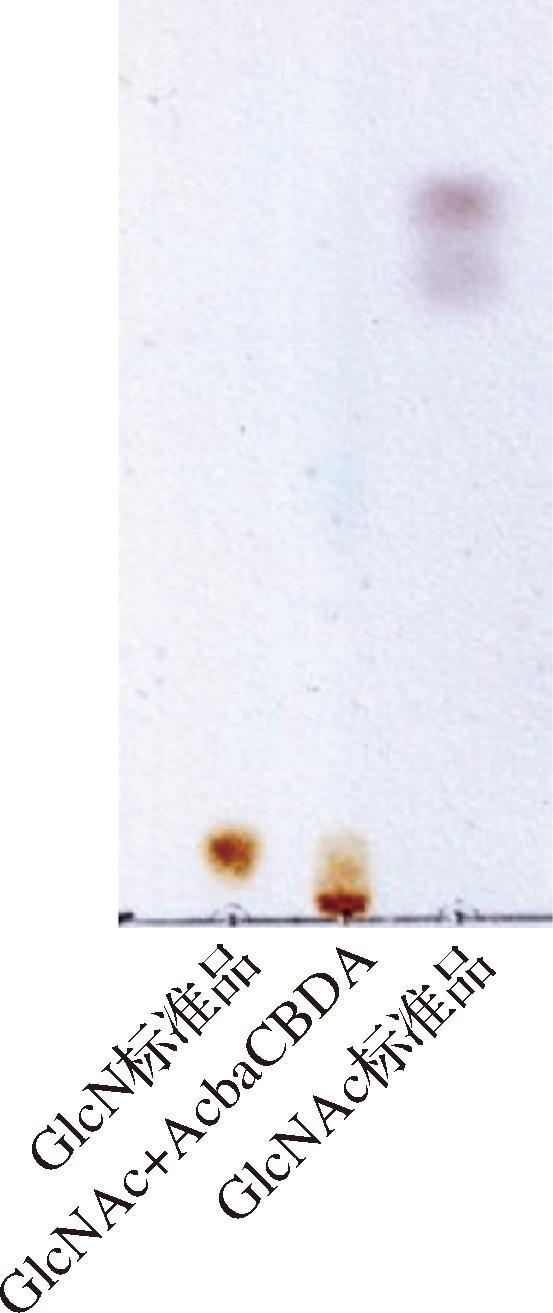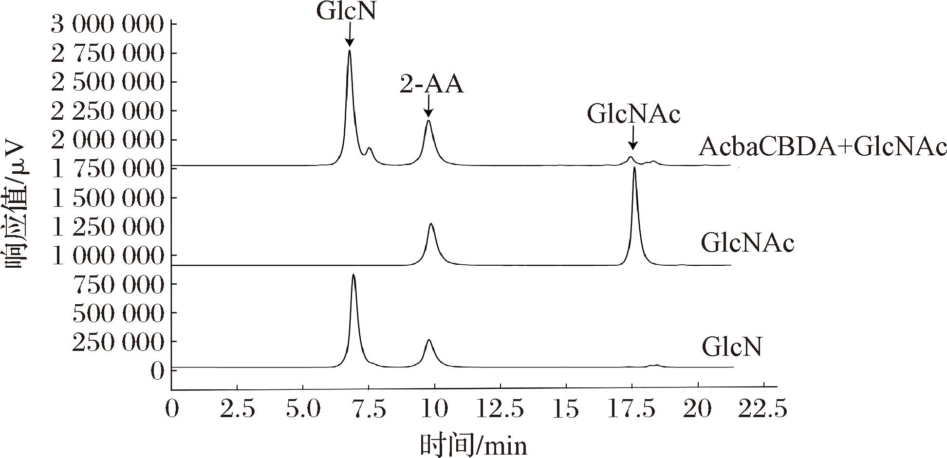 以GlcNAc溶液(20 mmol/L)为反应底物,检测重组AcbaCBDA的脱乙酰活性。采用薄层层析法,使用V(正丁醇)∶V(乙醇)∶V(水)=5∶3∶2的延展剂分离样品,用DPA(4 g二苯胺、4 g苯胺、5 mL磷酸和50 mL丙酮)显色,初步测定酶是否具有GlcNAc脱乙酰活性。利用高效液相色谱进一步确定酶是否具有活性,HPLC条件:反相C18色谱柱 Hyperclone 5 μmol/L ODS120 Å(4.60 mm ID×250 mm);流动相A为质量分数为1%四氢呋喃(tetrahydrofuran,THF)、0.5%(质量分数)磷酸和0.2%(质量分数)正丁胺的水溶液;流动相B为乙腈;流速为1 mL/min;进样量为10 μL;激发波长为360 nm,发射波长为425 nm。样品被2-氨基苯甲酸(2-aminobenzoic acid,2-AA)标记后,经HPLC检测[21]。
