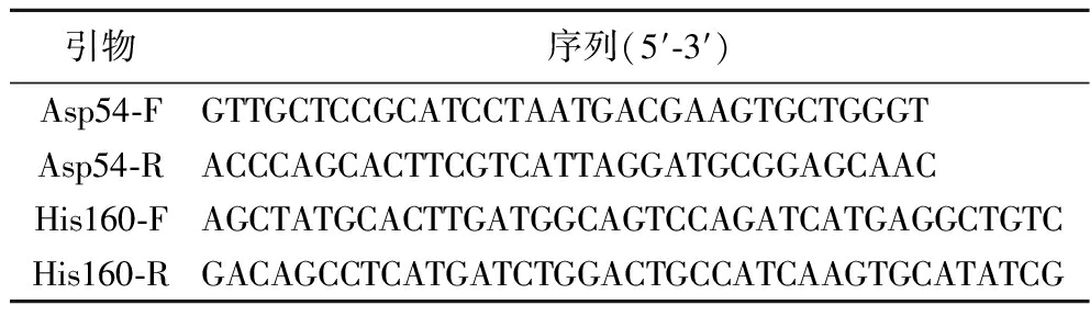 引物序列(5′-3′)Asp54-FGTTGCTCCGCATCCTAATGACGAAGTGCTGGGTAsp54-RACCCAGCACTTCGTCATTAGGATGCGGAGCAACHis160-FAGCTATGCACTTGATGGCAGTCCAGATCATGAGGCTGTCHis160-RGACAGCCTCATGATCTGGACTGCCATCAAGTGCATATCG