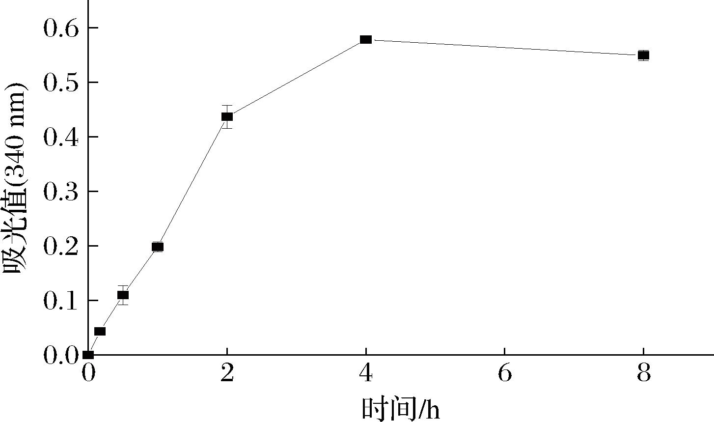 重组AcbaCBDA与GlcNAc(终浓度为100 mmol/L)反应生成的GlcN含量随时间变化如图7所示,反应前2 h 反应速度最快,之后反应速度逐渐减慢,产物量随时间延长逐渐达到最大值,同时反应速率慢慢趋于零。经计算,重组AcbaCBDA的比酶活力为17.82 U/mg。