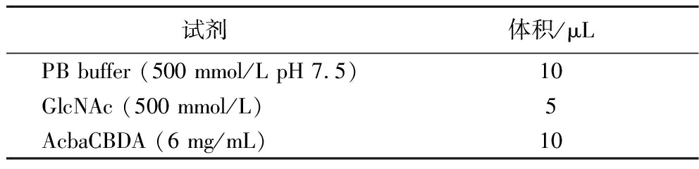 试剂体积/μLPB buffer (500 mmol/L pH 7.5)10GlcNAc (500 mmol/L)5AcbaCBDA (6 mg/mL)10