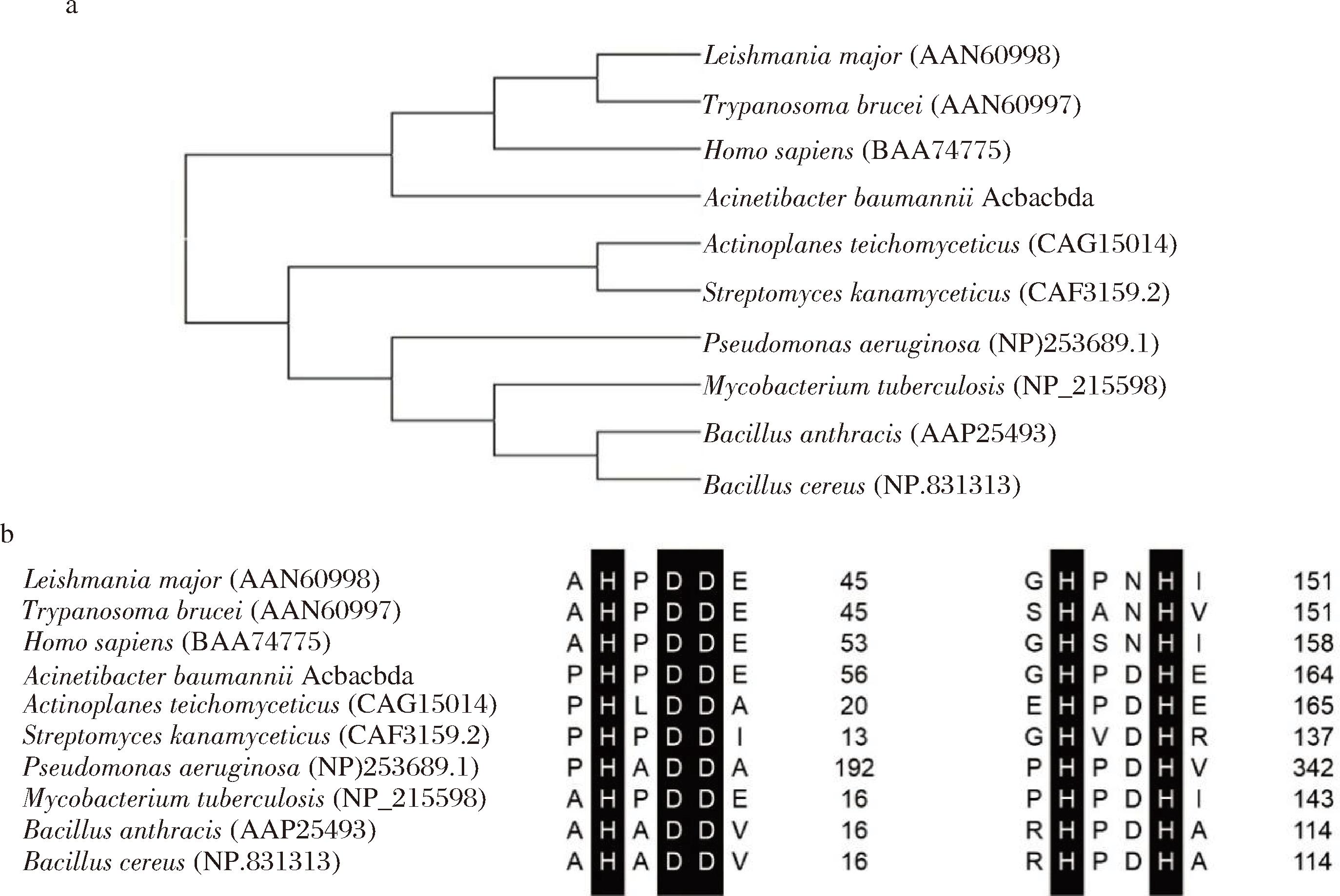 从NCBI数据库中搜寻到A.baumannii基因组中有编码GlcNAc脱乙酰酶的潜在序列,该蛋白属Pig-L家族脱乙酰酶。搜索下载相关9个脱乙酰酶氨基酸序列(Pig-L家族),利用Genedoc软件进行同源性分析,MEGA软件建立系统发育树,方法为Neighbor-Joining,Bootstrap设置为1 000。