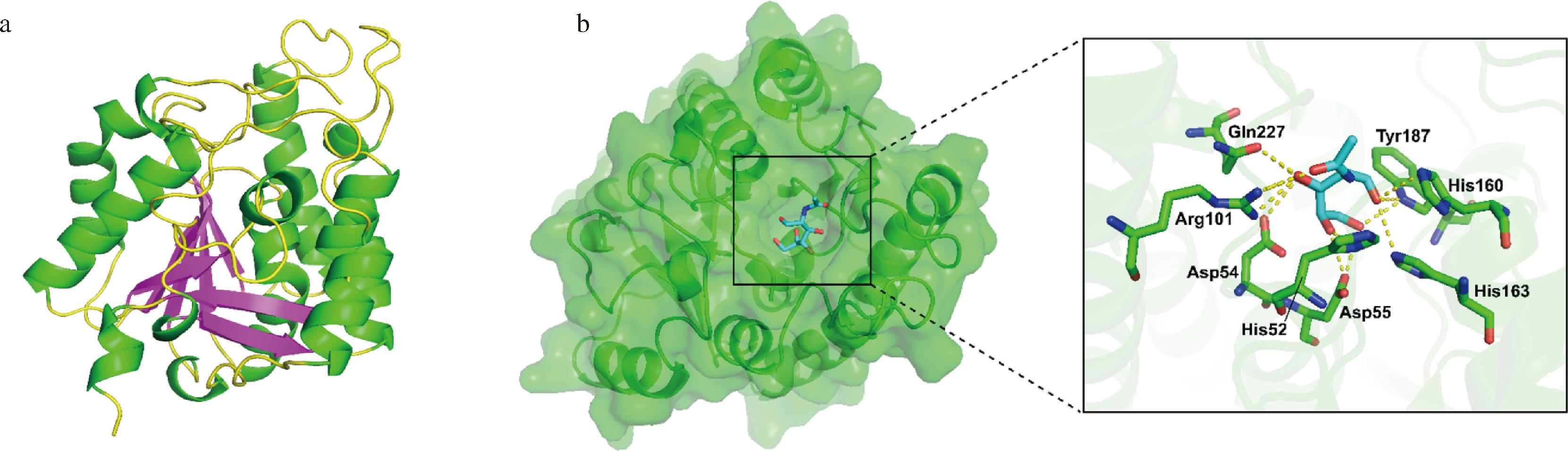 如图10-a所示,目标蛋白的三维结构模型整体呈球形,包含3层(α/β/α)三明治特征结构,由7个反向平行的β-折叠和7个α-螺旋组成。Alphafold3给出的预测模板建模(pTM)分数为0.95,说明此蛋白本次预测结构准确性较高。重组AcbaCBDA与底物小分子GlcNAc对接结果如图10-b所示,此构象结合位点的结合能为-6.7 kcal/mol,亲和力最高,故选择此构象进行分析。Gln227、Tyr187、His163、His160、Arg101、Asp55、Asp54、His52与底物形成氢键相互作用,这些氢键将小分子稳定在蛋白中央的活性口袋。该模型GlcNAc分子与蛋白结合的氨基酸残基与Pig-L家族高度保守位点相同,进一步说明对接结果和同源性分析结果的准确性。