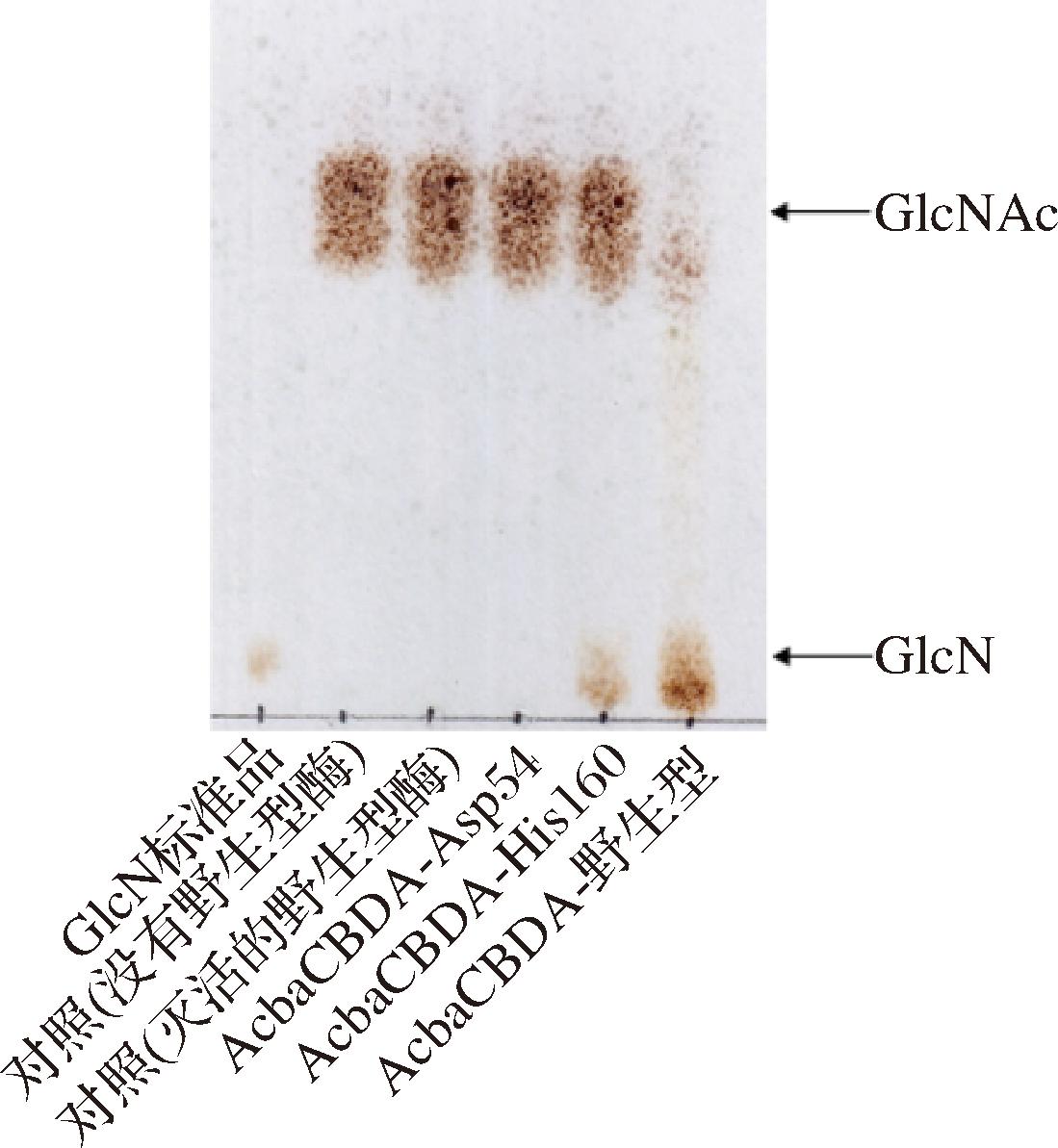 将突变成功的2个突变体蛋白表达纯化后与GlcNAc反应,得到的结果如图9所示,TLC结果表明,54号位的Asp突变为Asn后,突变酶完全失活,而160号位的His突变为Ser后,突变酶只有微弱活性。Asp54决定了酶是否有活性,而His160对酶活性的影响较小。因重组蛋白经亲和层析镍柱纯化,纯化蛋白液中可能有镍离子残留,2.4.3节结论得出镍离子能显著提高酶活性,故推测His160其可能是金属离子结合残基,突变后的酶因不能结合金属离子而导致酶活性下降。综上,Asp54与His160是重组酶的关键催化残基。
