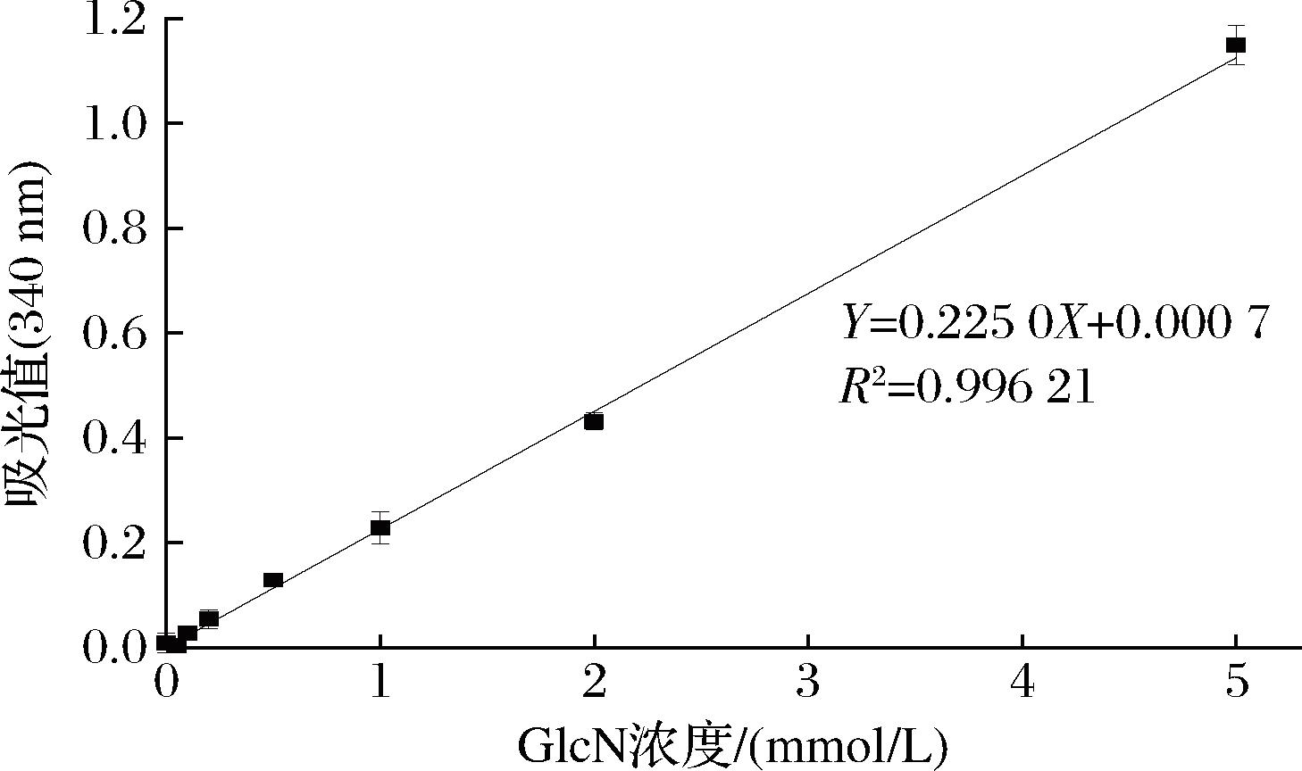邻苯二甲醛(o-phthalaldehyde,OPA)能与氨基集团结合,反应生成的衍生物在340 nm处具有吸光值[21],采用此方法用于酶活性分析。取96孔板,取10 μL不同浓度的GlcN(0、50、100、200、500 μmol/L、1、2、5 mmol/L)标准品,加入100 μL OPA试剂,每个浓度设置4个平行,测得数据并制作标准曲线见图1。当底物浓度为0~5 mmol/L时,标准曲线呈现线性状态,说明该方法可应用于脱乙酰酶的活性测定。