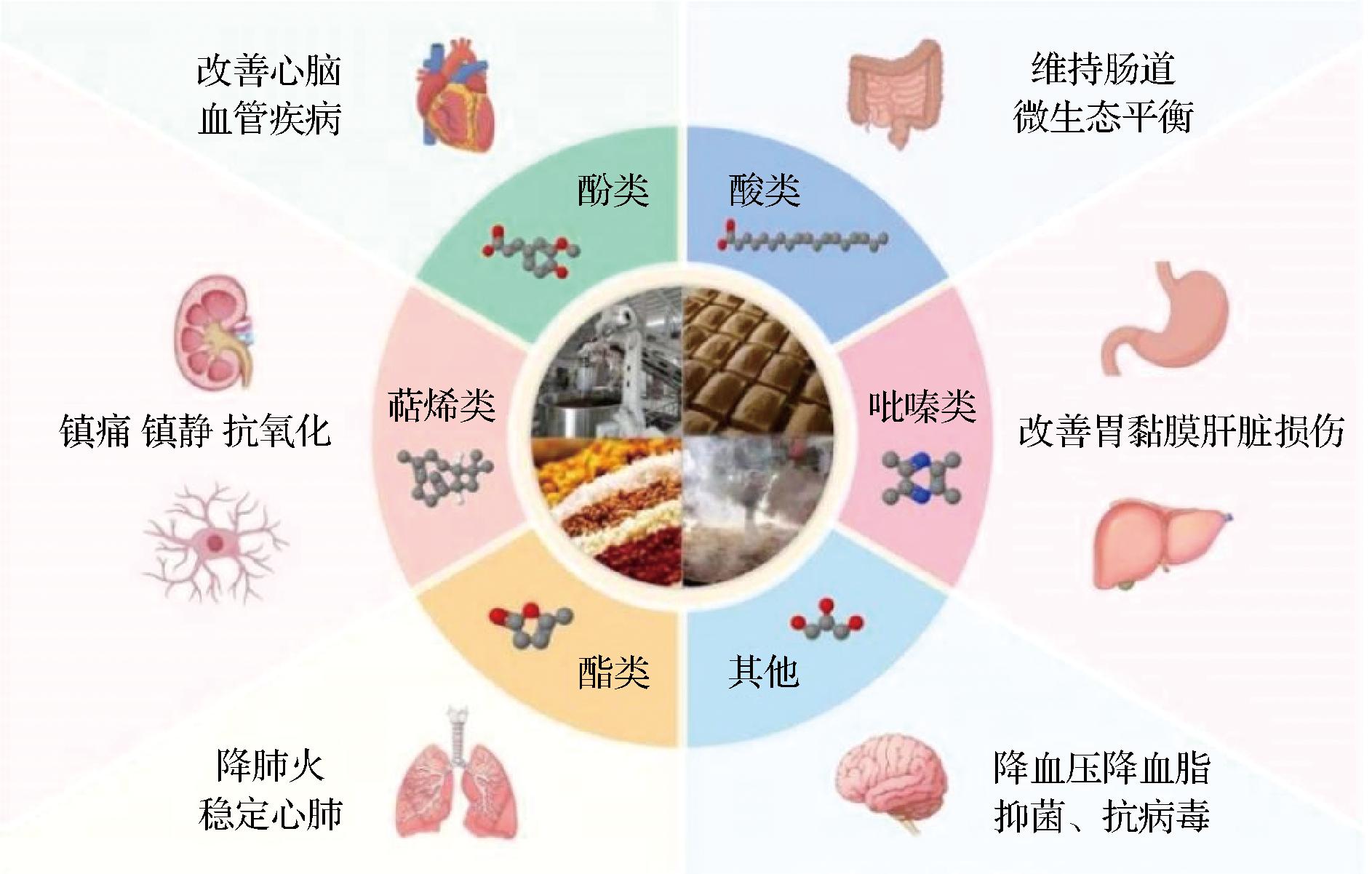 白酒中包含多种健康活性因子:阿魏酸作为酚类化合物的代表性物质,具有抗氧化、抗炎、抗血栓等保健功能,挥发性酚类物质如4-甲基愈创木酚则兼具抗氧化与增强免疫力的潜在作用[7-8];酸类化合物中,乙酸可杀菌助消化,乳酸能调节肠道菌群,丁酸具有抑制肿瘤细胞生长的效果[9];酯类作为白酒主要香味物质,部分酯类同样具备健康功效,例如己酸乙酯可改善心肺功能[10],亚油酸乙酯能预防动脉粥样硬化[11]。吡嗪类化合物中的四甲基吡嗪,不仅能够改善酒精对胃黏膜和肝脏的损伤,也是治疗心脑血管疾病的重要成分,同时还对白酒风味贡献显著[12]。此外,白酒中含有萜烯醚、萜烯醇、萜烯酮等多种萜烯类化合物,具有抗菌、抗肿瘤等活性[13]。除上述几类物质,白酒中还含有其他具有健康活性的成分,其中γ-氨基丁酸可镇静降压[14],洛伐他汀能调节胆固醇水平,预防心血管疾病[15],多种活性肽具有抗氧化、抑菌抗炎活性[16]。