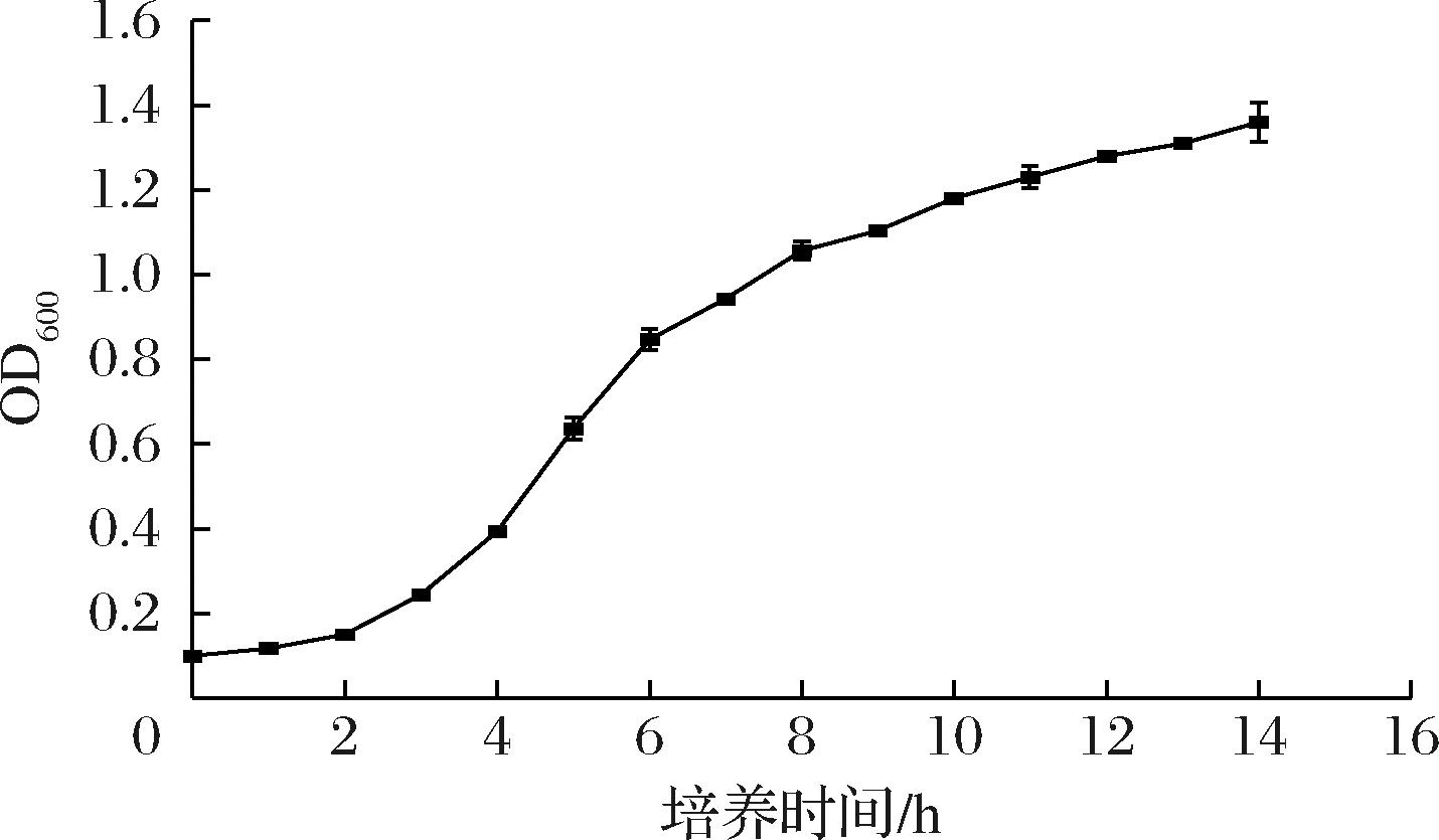 乳酸菌间的差异使得不同乳酸菌的电转化条件有所不同,需要根据宿主自身做出调整。在Lactobacillus属中,影响电转化效率的主要因素为感受态细胞的细胞壁状态、电转化时缓冲液与细胞内的渗透压平衡以及合适的转化电压。在对数生长期前期,细胞正处于快速分裂和生长的状态,细胞膜相对较薄且具有较高的通透性。这种通透性使得外源DNA能够更容易地进入细胞,从而提高电转化的效率。此外,处于此阶段的细胞生长代谢处于最活跃的阶段,拥有更强的应对外界刺激的能力,因而能降低电转化过程导致的死亡率。测定L. paralimentarius LBM12001生长曲线(图2),选择培养3 h的L. paralimentarius LBM12001制备感受态,此时细胞处于对数生长期前期。
