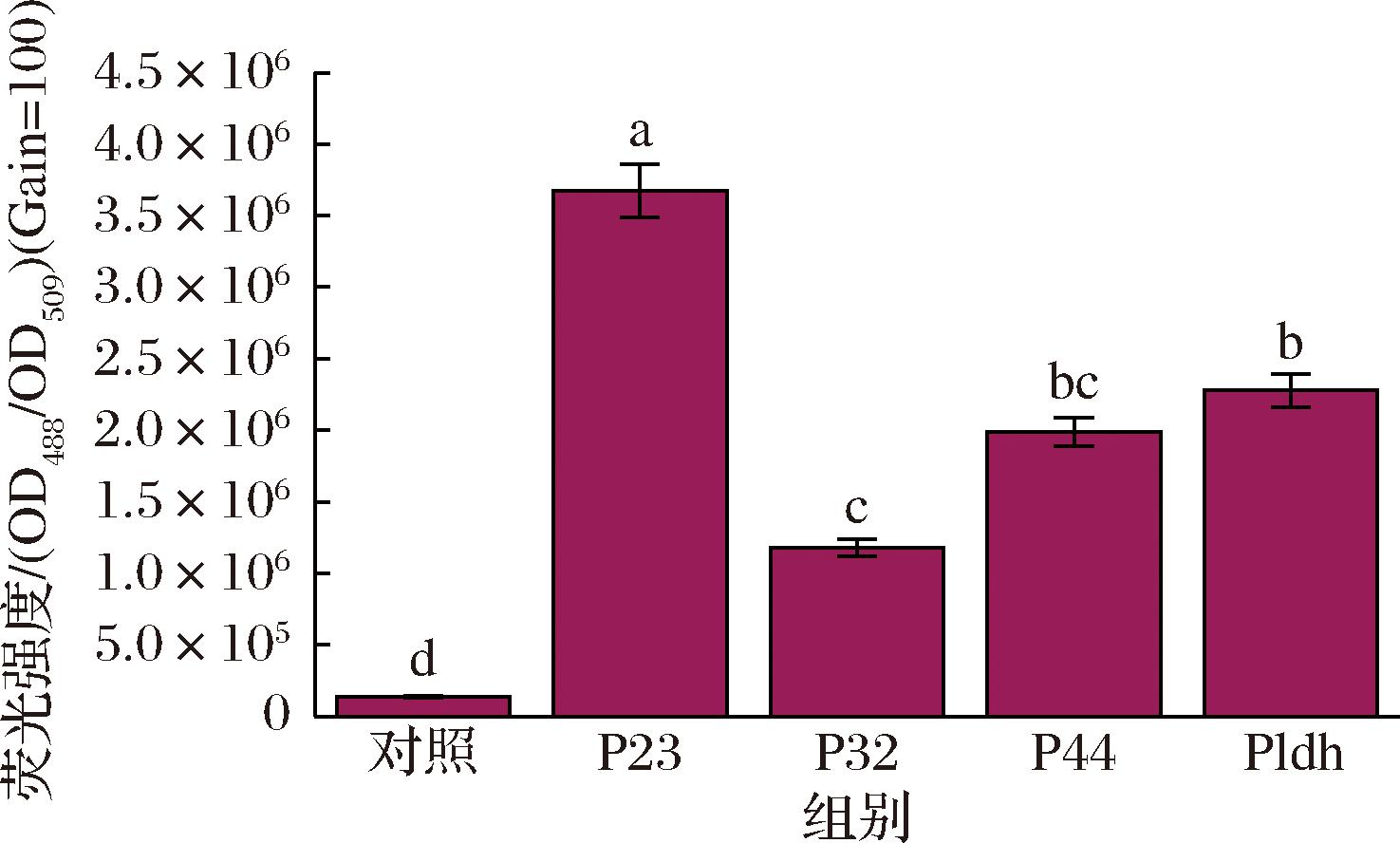 为了确保CRISPR/Cas9相关元件的高效表达,根据已有文献报道初步筛选乳酸菌中常用的启动子P23[15]、P32[16]、P44[17]、Pldh[18]。这些启动子具有不同的表达强度和特异性,选择合适的启动子对于提高目的基因的表达效率至关重要。将pMG36e-Promoter-eGFP表达载体转化至L.paralimentarius中,按照1.2.2节所述方法测定荧光强度,结果如图4所示。