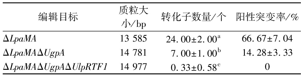 抗性平板上所有转化子的测序结果统计在表3。结果显示,随着编辑基因的数量增加转化子的数量与正确阳性突变率大幅下降,ΔLpaMAΔUgpA与ΔLpaMAΔUgpAΔUlpRTF1生成的转化子数量与阳性突变率显著低于ΔLpaMA(P<0.05),推测其原因是编码在质粒上的修复模板数增加,使得质粒大小过大难以穿过电转化形成的孔隙,此外多个Cas9蛋白-sgRNA复合体引发的基因组多位点断裂给宿主带来的DNA修复压力过大可能也是引发此现象的原因。