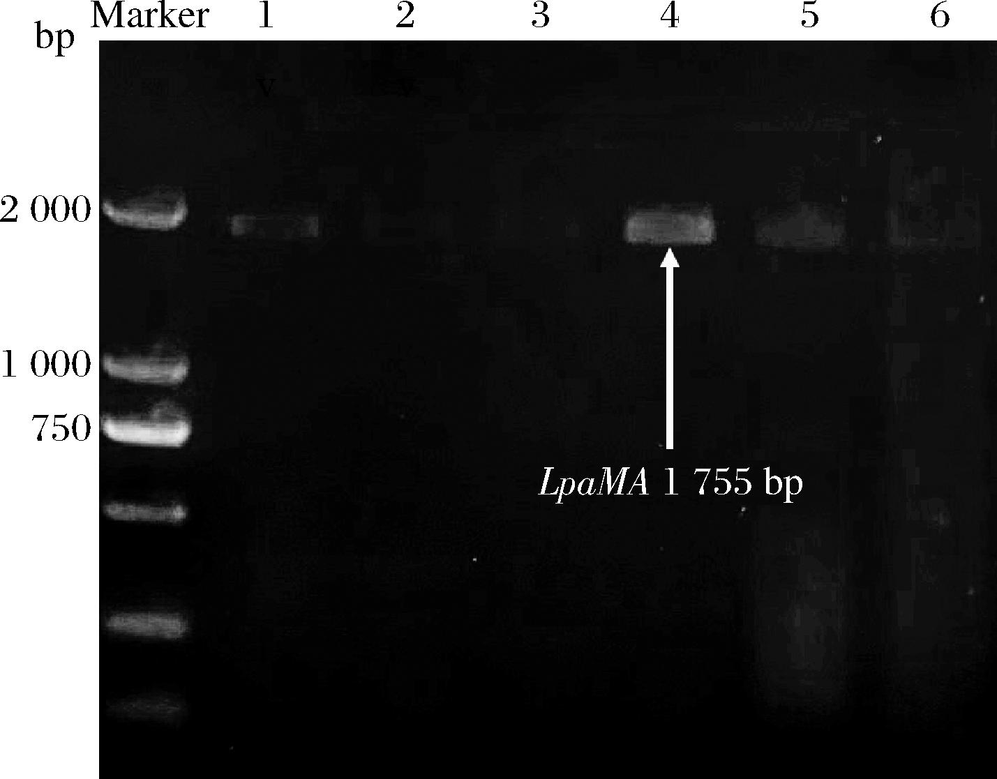 按照1.2.3节、1.2.4节的方法构建基因LpaMA敲除质粒pIBE01-ΔLpaMA、pIBE02-ΔLpaMA。基因编辑后挑取平板上的转化子,接种至5 mL液体MRS培养基中培养24 h后提取基因组。用LpaMA-F/LpaMA-R为上下游引物,以各个转化子的基因组为模板进行PCR,部分PCR产物的凝胶电泳结果如图6所示。除4号泳道的条带清晰可见外,1、2、3、5、6号泳道均有模糊条带。将PCR产物送测序,测序图谱结果显示同一位置显示多种碱基信号,提示可能存在混合基因型。