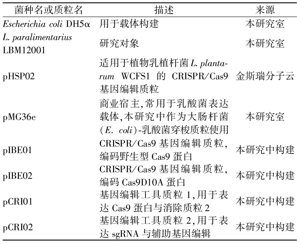 菌种名或质粒名描述来源Escherichia coli DH5α用于载体构建本研究室L.paralimentarius LBM12001 研究对象本研究室pHSP02适用于植物乳植杆菌L.planta-rum WCFS1的CRISPR/Cas9基因编辑质粒金斯瑞分子云pMG36e商业宿主,常用于乳酸菌表达载体,本研究中作为大肠杆菌(E. coli)-乳酸菌穿梭质粒使用本研究室pIBE01CRISPR/Cas9基因编辑质粒,编码野生型Cas9蛋白本研究中构建pIBE02CRISPR/Cas9基因编辑质粒,编码Cas9D10A蛋白本研究中构建pCRI01基因编辑工具质粒1,用于表达Cas9蛋白与消除质粒2本研究中构建pCRI02基因编辑工具质粒2,用于表达sgRNA与辅助基因编辑本研究中构建