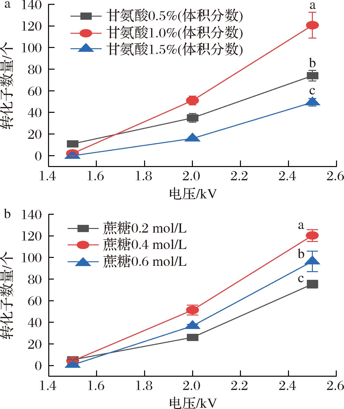 甘氨酸能够替代乳酸菌细胞壁肽聚糖层中的D-丙氨酸,使得其形成更为松散的肽聚糖结构,从而使细胞壁的通透性增加,更易于外源DNA进入。蔗糖可作为渗透压保护剂,其可维持乳酸菌的细胞渗透压平衡,防止细胞在电转化过程中因渗透压变化而破裂。合适的电压可以确保乳酸菌或其他细菌细胞在电转化过程中的膜孔化程度恰到好处,从而提高外源DNA进入效率,提升转化效率,并减少细胞损伤和死亡。选用广谱宿主质粒pMG36e作为E. coli DH5α-L.paralimentarius LBM12001穿梭质粒,以含有红霉素抗性的琼脂MRS平板上产生转化子的个数为基准探究L. paralimentarius LBM12001的最适电转化条件。研究结果(图3)显示当转化电压为2.5 kV时,添加终体积分数为1%的甘氨酸、0.4 mol/L的蔗糖可以显著提升转化子的数量(P<0.05)。