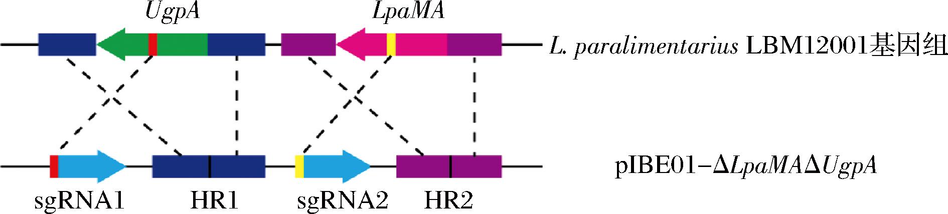 构建能够满足工业应用需求的L.paralimentarius LBM12001细胞工厂,需要一种高效的基因组规模编辑工具,以便精确、快速地对多个基因进行大规模改造,从而提升其生产性能和产物合成效率。利用pIBE单质粒编辑系统尝试对L.paralimentarius LBM12001进行多基因编辑。选定LpaMA、UgpA(ABC转运蛋白酶)与UlpRTF1基因作为研究对象,分别构建编辑质粒pIBE01-ΔLpaMAΔUgpA与pIBE01-ΔLpaMAΔUgpAΔUlpRTF1用于获取L.paralimentarius LBM12001 ΔLpaMAΔUgpA与L.paralimentarius LBM12001 ΔLpaMAΔUgpAΔUlpRTF1菌株,编辑质粒pIBE01-ΔLpaMAΔUgpA构建示意图如图8所示,pIBE01-ΔLpaMAΔUgpAΔUlpRTF1运用类似的方法构建。