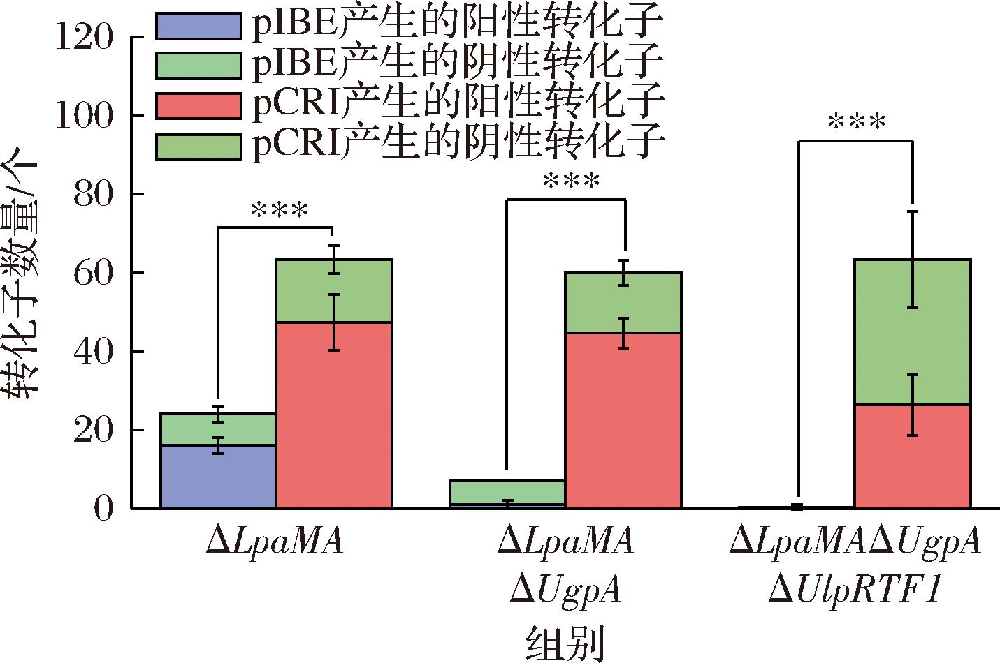 编辑目标质粒大小/bp转化子数量/个阳性突变率/%ΔLpaMA13 58524.00±2.00a66.67±7.04ΔLpaMAΔUgpA14 7817.00±1.00b14.28±3.33ΔLpaMAΔUgpAΔUlpRTF114 9770.33±0.58c0