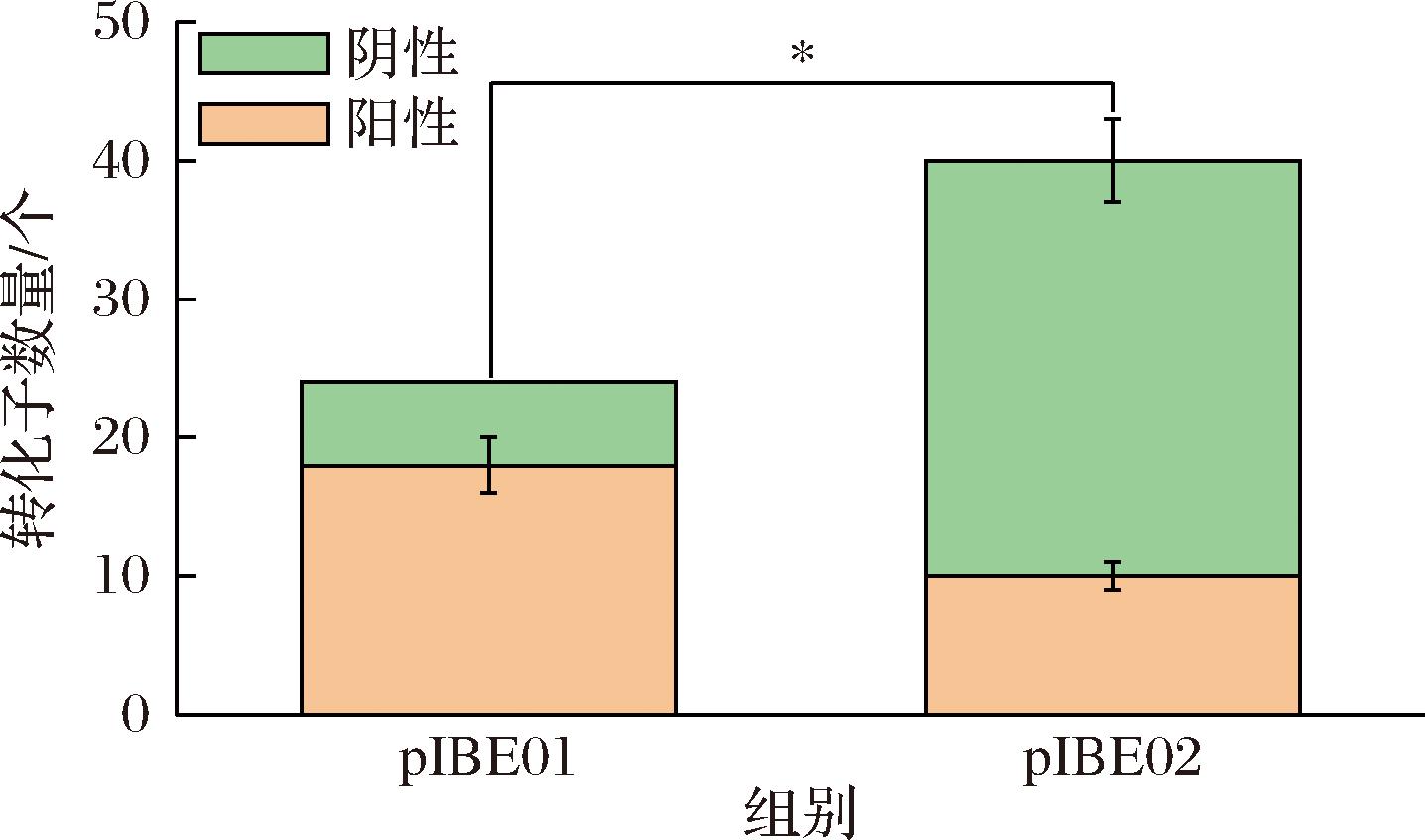 图7 基因编辑质粒pIBE01-ΔLpaMA、pIBE02-ΔLpaMA产生的阴性与阳性转化子数量