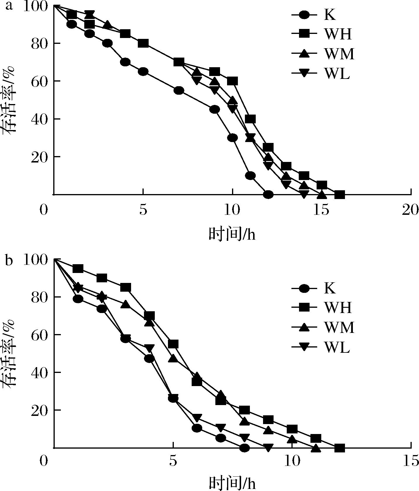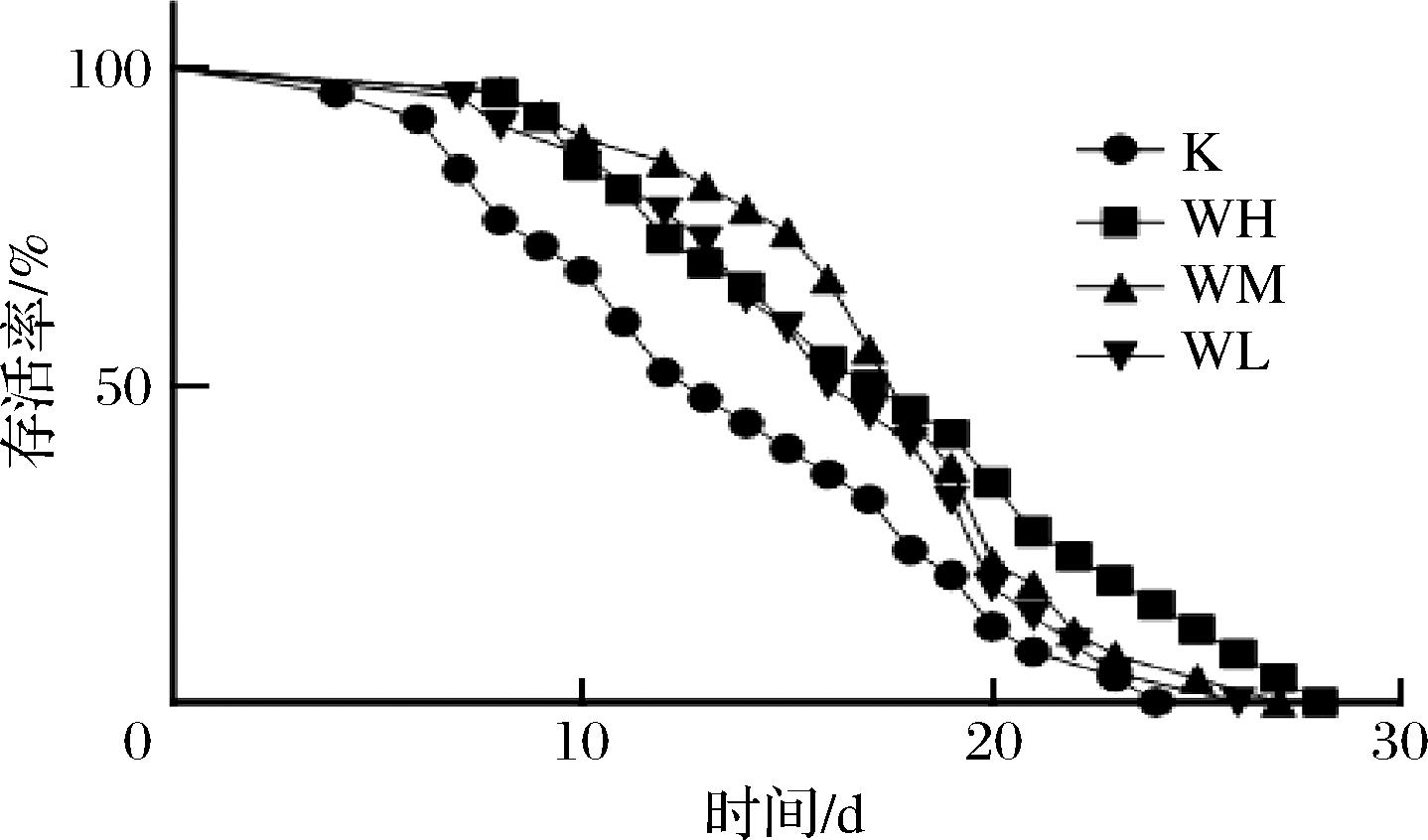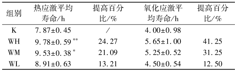 组别热应激平均寿命/h提高百分比/%氧化应激平均寿命/h提高百分比/%K7.87±0.45/4.00±0.98WH9.78±0.59∗∗24.275.65±1.0041.25WM9.53±0.38∗21.095.25±0.5231.25WL8.91±0.6313.214.50±0.5412.50
