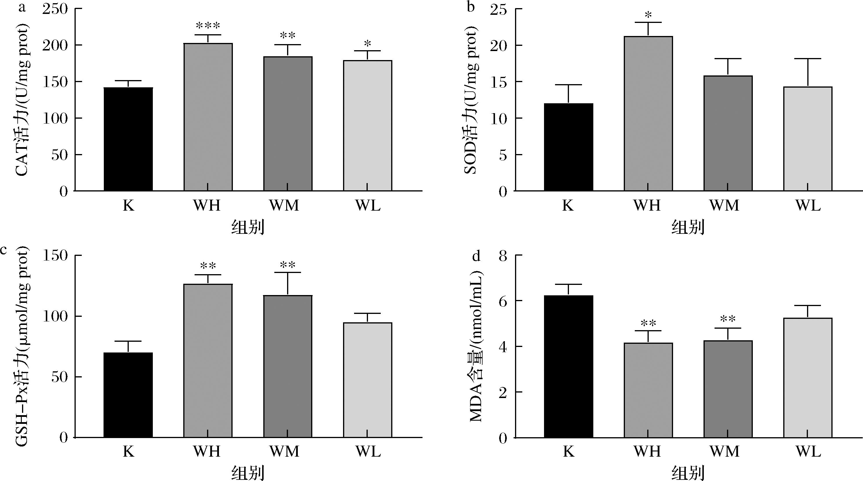 a-CAT水平;b-SOD水平;c-GSH-Px水平;d-MDA含量