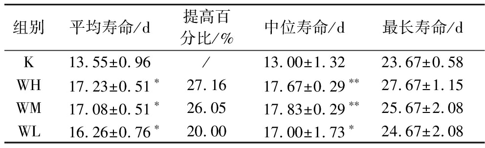 组别平均寿命/d提高百分比/%中位寿命/d最长寿命/dK13.55±0.96/13.00±1.3223.67±0.58WH17.23±0.51∗27.1617.67±0.29∗∗27.67±1.15WM17.08±0.51∗26.0517.83±0.29∗∗25.67±2.08WL16.26±0.76∗20.0017.00±1.73∗24.67±2.08