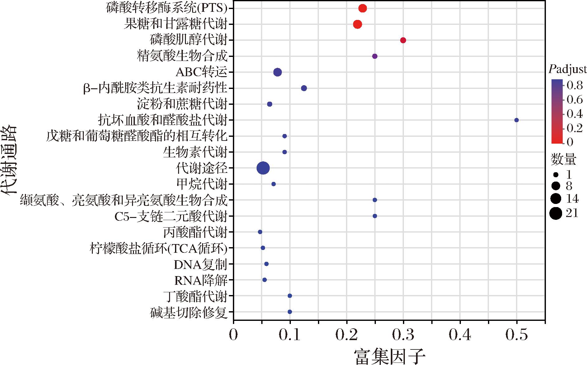 对MGO组差异表达蛋白集进行KEGG通路富集分析,从而确定显著上调的通路。结果见图6,在α=0.01的显著水平下,存在2个差异蛋白代谢通路显著富集,分别是果糖和甘露糖代谢以及磷酸转移酶系统(phosphotransferase system,PTS),富集因子分别为0.219 5和0.228 6。在果糖和甘露糖代谢途径中,过量表达的蛋白包括果糖二磷酸醛缩酶、塔格糖-6-磷酸激酶和甘露醇-1-磷酸5-脱氢酶。果糖二磷酸醛缩酶在糖代谢途径中发挥关键作用,可在乳酸菌中将1,6-二磷酸果糖转化二羟基丙酮磷酸盐,对糖酵解、糖异生至关重要[20]。塔格糖-6-磷酸激酶主要与戊糖代谢相关,将D-塔格糖-6-磷酸进一步磷酸化为D-塔格糖-1,6-二磷酸[21]。甘露醇-1-磷酸5-脱氢酶可能参与甘露醇的代谢,初步将甘露醇氧化为甘露糖,有利于后续参与到糖酵解途径中。在工业生产MGO-鼠李糖乳酪杆菌合生元时,通过实时监测果糖二磷酸醛缩酶、塔格糖-6-磷酸激酶和甘露醇-1-磷酸5-脱氢酶等蛋白的表达含量变化,可评估发酵速率并确定发酵终点。在PTS中,过量表达的组分有PTS果糖转运蛋白亚基、PTS甘露醇特异性EIICB成分、PTS山梨糖醇特异性IIA组分。PTS是碳水化合物运输系统,用于细胞摄取外界碳源(如葡萄糖、葡萄糖酸等),同时磷酸化。在碳源的利用和代谢调控中发挥着重要作用。添加MGO后,依赖PTS的糖转运可能提升MGO在鼠李糖乳酪杆菌EN-08的利用效率,加速菌体能量代谢。与前期研究中发现的促增殖能力结果相符。