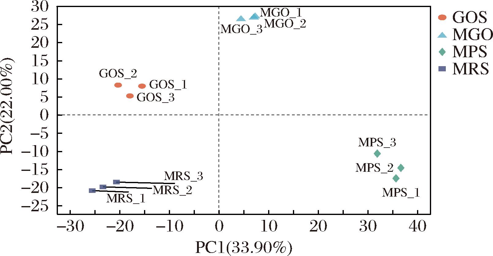 图2的主成分分析显示了样本间的相似性, PC1和PC2的方差贡献率分别为33.90%、22.00%,共反映了全部信息的55.90%。4个组之间距离较远,表明不同处理组的全蛋白存在差异。此外,MRS对照组与MGO、MPS的距离较远,与GOS组距离最近,说明MRS组与MGO组、MPS组相似度较小,与GOS相似度较高。