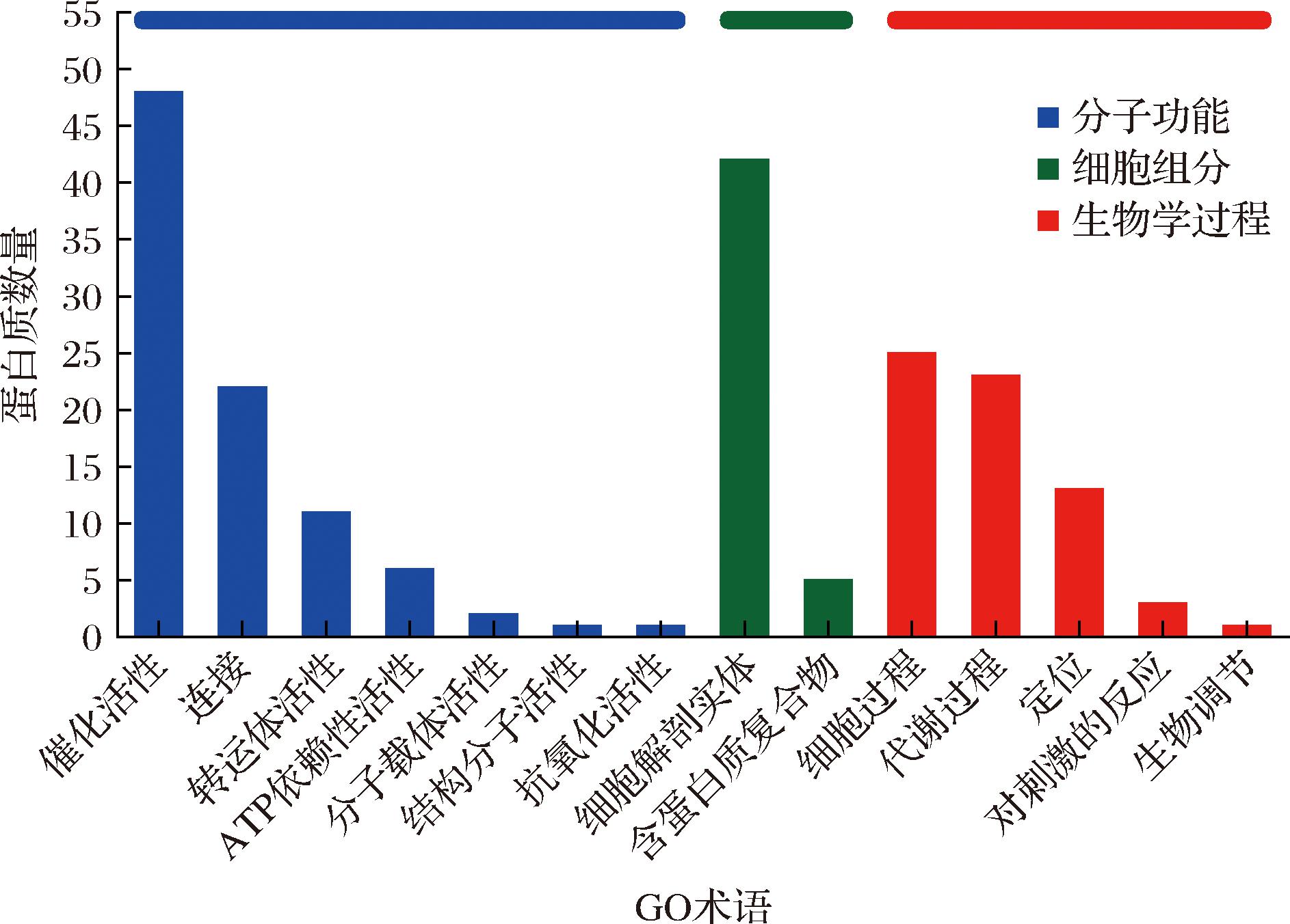 利用GO注释对上调差异蛋白从分子功能、生物学过程和细胞组分进行分析,GO注释结果如图8所示,在分子功能分类中,差异上调蛋白具有ATP依赖性活性(ATP-dependent activity,6个蛋白)、转运体活性(transporter activity,11个蛋白)、连接(binding,22个蛋白)、催化活性(catalytic activity,48个蛋白)等方面的功能。差异上调蛋白参与的生物学过程包括细胞过程(cellular process,25个蛋白)、代谢过程(metabolic process,23个蛋白)、定位(localization,13个蛋白)、对刺激的反应(response to stimulus,3个蛋白)和生物调节(biological regulation,1个蛋白)。从细胞组分的角度看,上调的蛋白基本位于细胞解剖实体(cellular anatomical entity,42个蛋白)和含蛋白质复合物(protein-containing complex,5个蛋白)中。