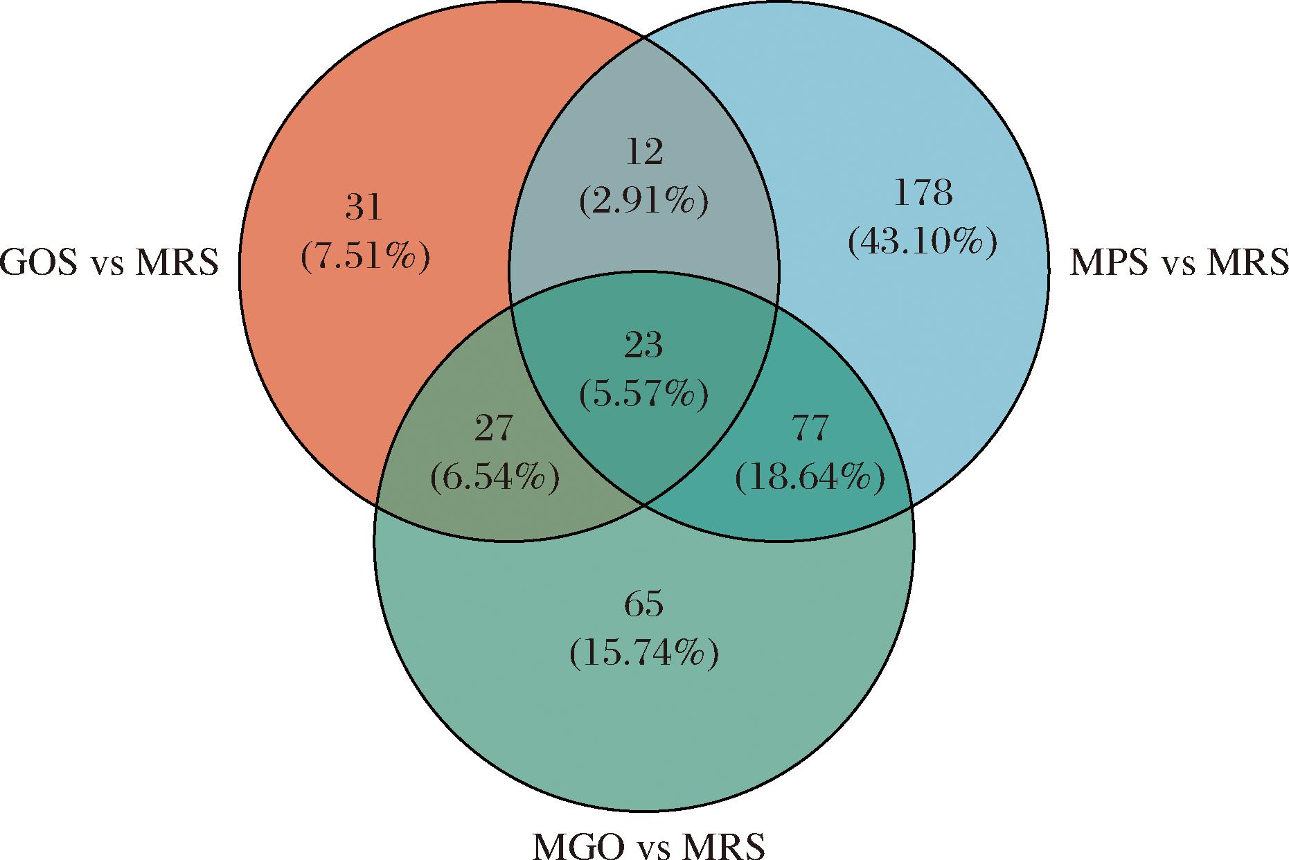 参考许家齐等[15]的表达值倍数(fold change,FC)变化并适当调整。以FC≥1.2,FC≤0.83,作为差异蛋白的筛选阈值,图3揭示了各处理组对比空白对照组引起的上调或下调差异蛋白的情况。可以清晰地看出,这3种糖类物质对鼠李糖乳酪杆菌EN-08蛋白质表达的影响效果由大到小排序是:MPS、MGO、GOS。该结果可能是MPS能特异地对鼠李糖乳酪杆菌EN-08的基因转录进行正向调控导致的[16]。GOS vs MRS 的差异蛋白较少,有93个。而MPS vs MRS的差异蛋白有290个,MGO vs MRS 有192个,其中MGO组上调蛋白有110个,下调蛋白有82个。此外,图4展示了GOS vs MRS 组、MGO vs MRS 组和MPS vs MRS 组独有的差异蛋白分别是31、65、178个,3个处理组共有的差异蛋白有23个。