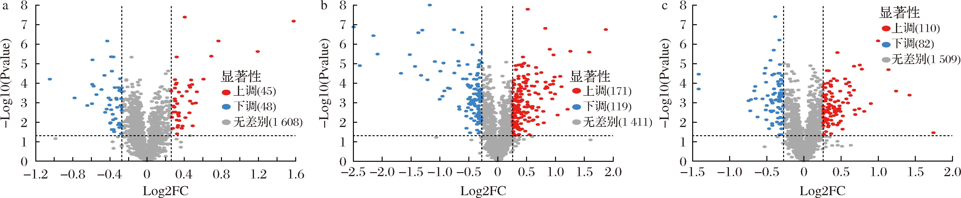 a-GOS vs MRS差异蛋白火山图;b-MPS vs MRS差异蛋白火山图;c-MGO vs MRS差异蛋白火山图