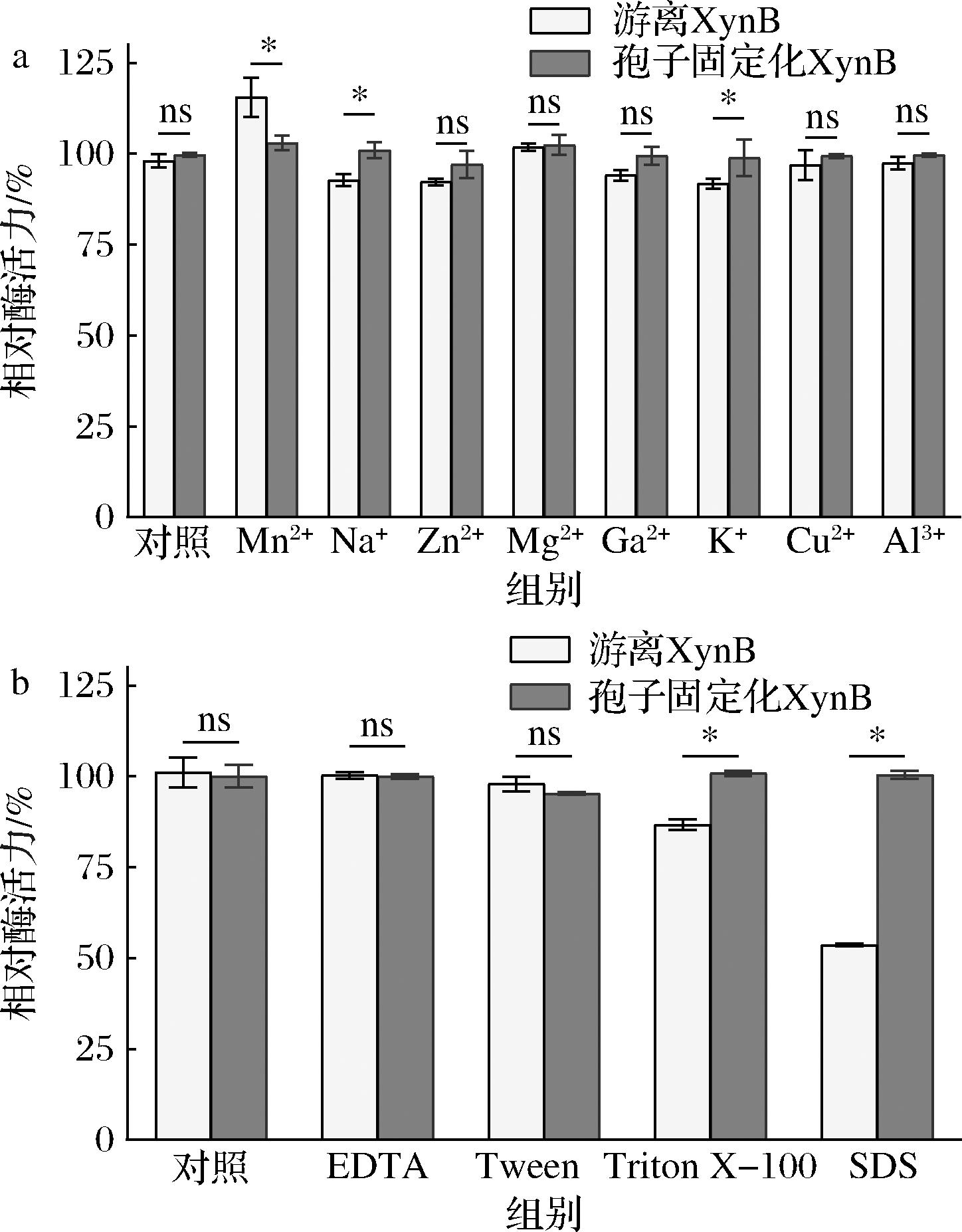 将游离酶和固定化酶置于不同金属离子终浓度为10 mmol/L的Mn2+、Na+、Zn2+、Mg2+、Ga2+、K+、Cu2+、Al3+及其他有机试剂[乙二胺四乙酸(ethylene diamine tetraacetic acid,EDTA)、吐温-80、Triton X-100、SDS]中孵育120 min,按照标准方法测定相应金属离子与有机试剂的酶活力,以不添加上述试剂的孢子固定化酶和游离酶活力为100%。