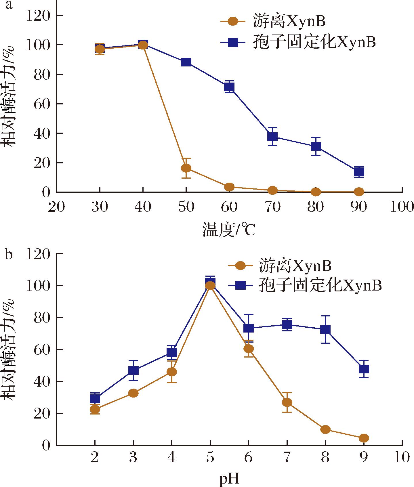 以毕赤酵母表达系统生产的游离态木聚糖酶XynB作为对照组,研究反应温度对osw2Δ孢子固定化XynB催化性能的影响。如图4-a所示,2组酶制剂均在40 ℃条件下达到峰值酶活力。当反应温度高于60 ℃时,游离XynB的酶活力迅速下降(残留活力为(58.83±1.77)%,固定化XynB仍保持(81.92±3.37)%的相对酶活力,表明在较高温度条件下,固定化酶具有更广的适用温度范围。最适pH研究表明(图4-b),2组酶制剂的最适反应pH均为5.0,与文献报道数据相符[24]。在极端pH条件(pH 2.0和pH 9.0)下,其相对酶活力较游离酶分别提升(43.59±2.40)%和(45.65±3.08)%,说明固定化酶具有更宽的pH适应范围。该结果表明独特的孢子壁结构为固定化XynB提供了良好的保护屏障,增强了目标酶作为生物催化剂的应用潜力[25]。
