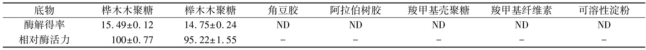 底物桦木木聚糖榉木木聚糖角豆胶阿拉伯树胶羧甲基壳聚糖羧甲基纤维素可溶性淀粉酶解得率15.49±0.1214.75±0.24NDNDNDNDND相对酶活力 100±0.7795.22±1.55-----