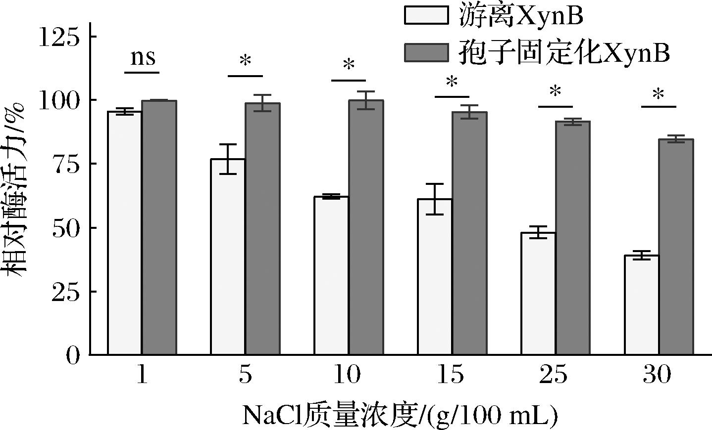 NaCl作为食品体系中的关键渗透调节物质,广泛存在于面制品、海产品、传统发酵制品等高盐基质中,此类环境对游离酶制剂的催化性能构成严峻挑战[29]。如图7所示,当NaCl质量浓度达到30 g/100 mL时,游离XynB的相对酶活力下降至(39.12±1.6)%,这可能是因为高盐缓冲体系会改变酶蛋白的部分结构,影响其与底物的结合,从而降低酶的催化活力。相比之下,孢子固定化XynB在相同盐胁迫条件下展现出优异的耐盐性能,残余酶活力维持在(84.76±1.42)%左右。该结果证明孢子固定化技术不仅能克服游离酶在高盐食品体系中的失活问题,更为其在海产品深加工、传统酿造等工业场景的应用提供了技术基础,具有广阔的产业化前景。