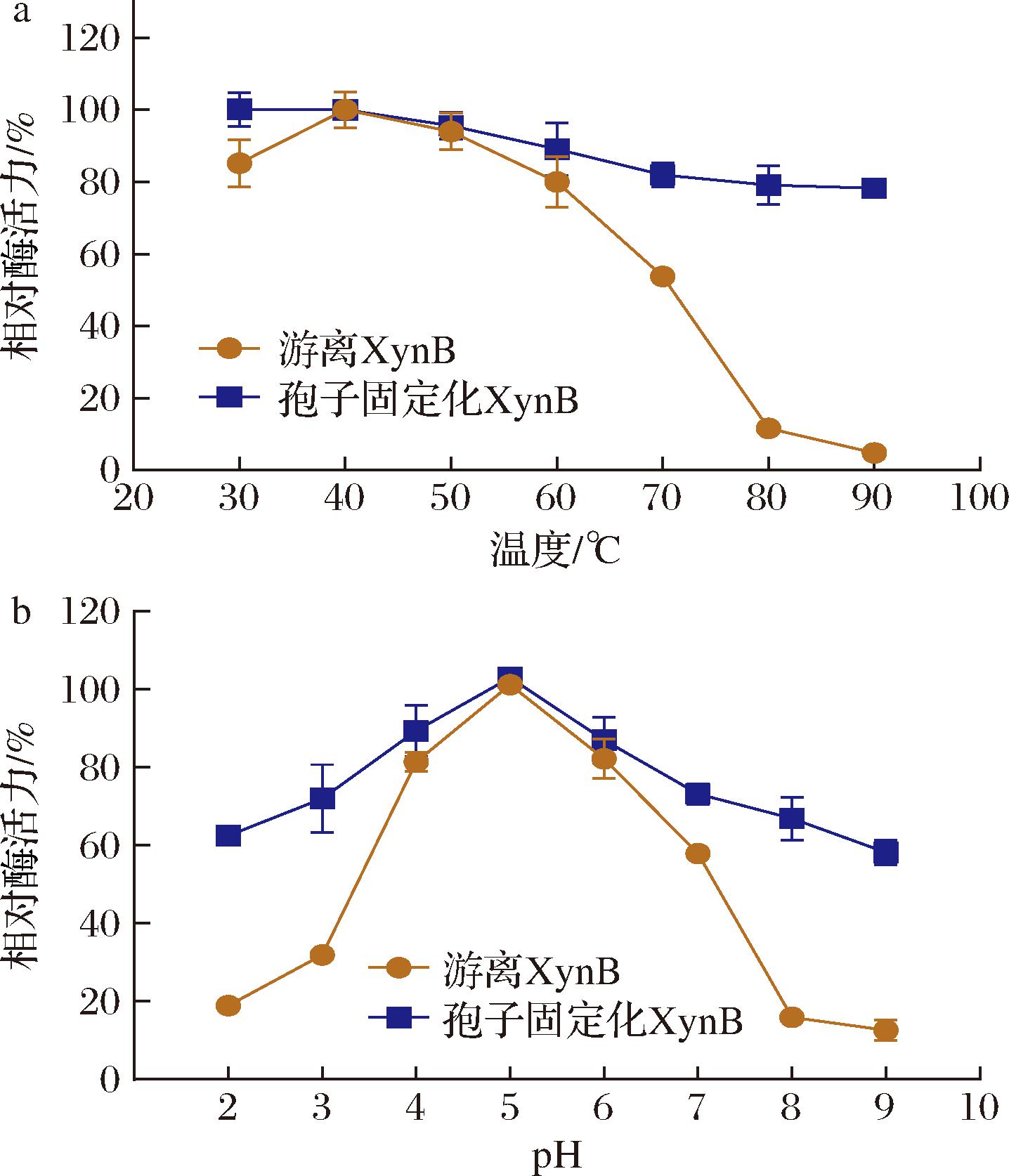 将游离酶和孢子固定化酶置于不同温度(30~90 ℃)下孵育120 min,按照标准方法测定相应温度的酶活力,以未孵育的孢子固定化酶和游离酶活力为100%。