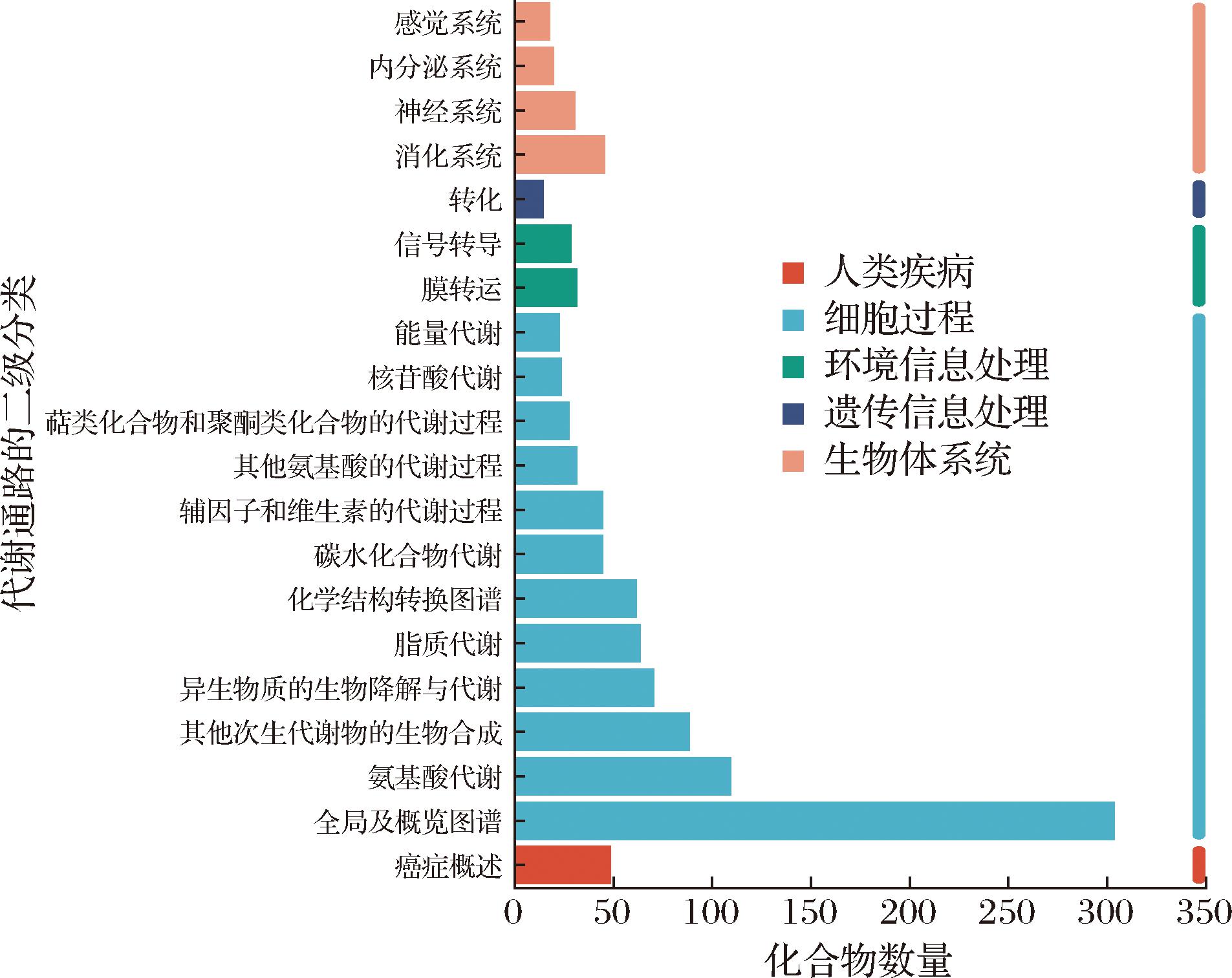 将代谢物与KEGG功能通路进行比对,由图3可知,NFS和LPS中总代谢物共注释1 031条通路,与细胞过程对应的化合物数量最多,其次是生物体系统,而遗传信息处理代谢物数量最少,表明在不同发酵方式下,微生物在酸笋发酵过程中的核心都主要围绕细胞过程展开,基本不会发生遗传信息变异,稳定性较好。NFS和LPS总代谢物的代谢通路主要包括氨基酸代谢、其他次生代谢物的生物合成、生物降解和代谢、脂质代谢和化学结构转换。其中,氨基酸代谢是最富集的通路,会对酸笋风味产生一定的影响。一方面,许多氨基酸本身具有呈味特性,在酸笋发酵过程中,多种呈味氨基酸协同作用,构成酸笋独特的风味;另一方面,氨基酸是许多风味化合物的前体[10],例如氨基酸会发生脱氨、脱羧反应,生成相应的醇类,或者通过Ehrlich途径转化为醛类,都是酸笋风味的重要组成部分。因此,NFS和LPS风味来源都主要是由于氨基酸代谢。