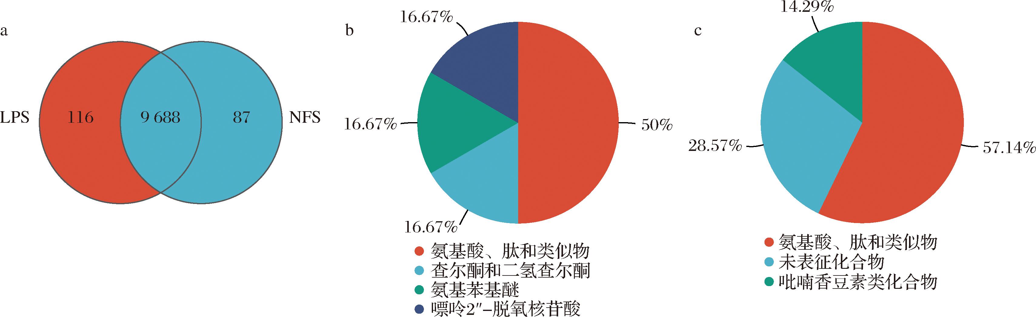 a-NFS和LPS的韦恩图;b-NFS特有代谢物饼图;c-LPS特有代谢物饼图