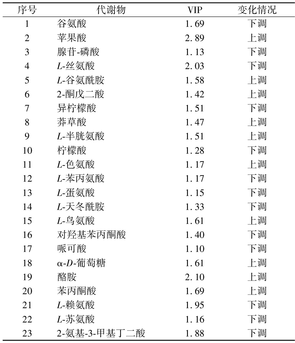 序号代谢物VIP变化情况1谷氨酸 1.69下调2苹果酸 2.89上调3腺苷-磷酸 1.13下调4L-丝氨酸 2.03下调5L-谷氨酰胺 1.58上调62-酮戊二酸 1.42上调7异柠檬酸 1.51下调8莽草酸 1.47上调9L-半胱氨酸 1.51上调10柠檬酸1.28下调11L-色氨酸1.17上调12L-苯丙氨酸 1.17下调13L-蛋氨酸 1.15下调14L-天冬酰胺 1.33下调15L-鸟氨酸 1.61上调16对羟基苯丙酮酸 1.40下调17哌可酸 1.10下调18α-D-葡萄糖 1.61上调19酪胺 2.10上调20苯丙酮酸 1.69上调21L-赖氨酸 1.95下调22L-苏氨酸 1.16下调232-氨基-3-甲基丁二酸1.88下调