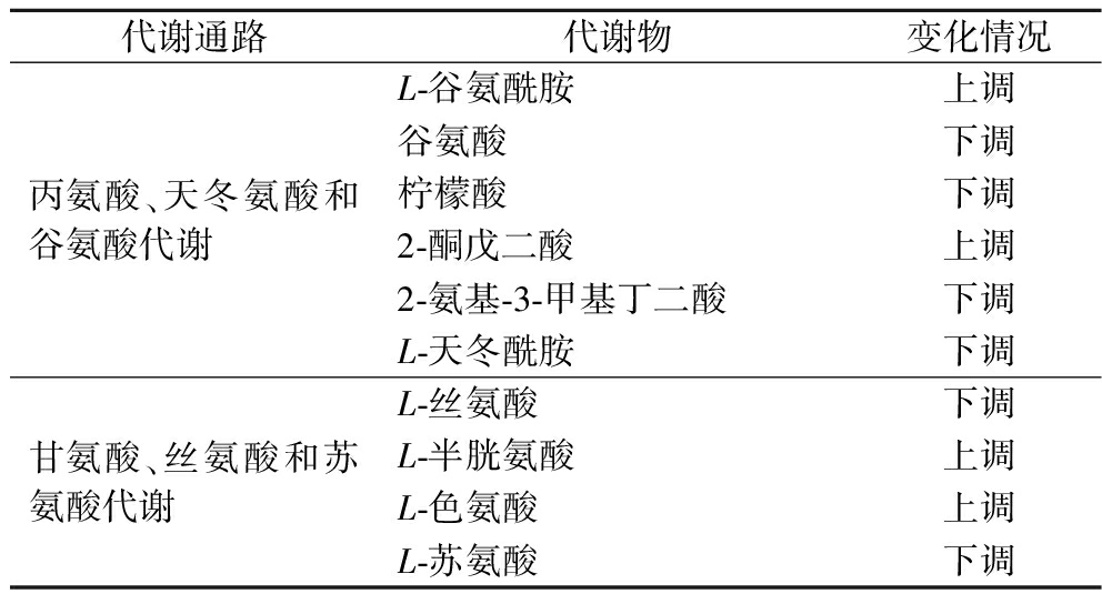 代谢通路代谢物 变化情况丙氨酸、天冬氨酸和谷氨酸代谢L-谷氨酰胺 上调谷氨酸 下调柠檬酸 下调2-酮戊二酸 上调2-氨基-3-甲基丁二酸 下调L-天冬酰胺 下调甘氨酸、丝氨酸和苏氨酸代谢L-丝氨酸 下调L-半胱氨酸 上调L-色氨酸 上调L-苏氨酸 下调