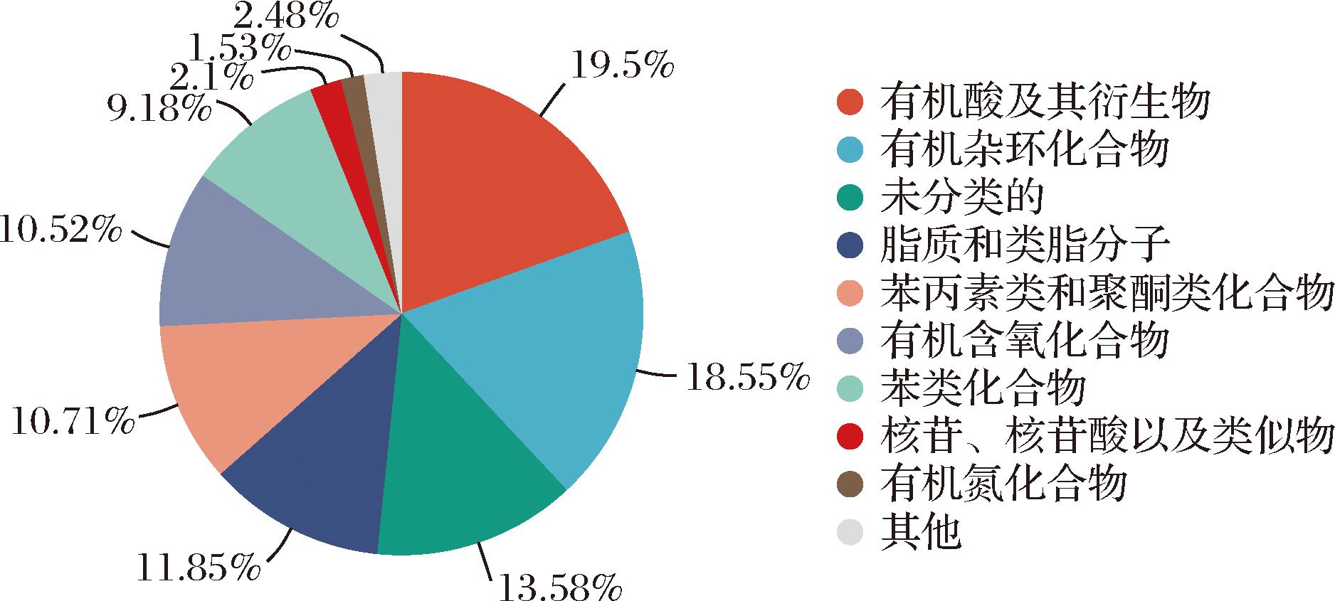 采用多维统计VIP>1和单变量统计P<0.05进行差异代谢物的筛选。如图5所示,在差异代谢物中,有机酸及其衍生物(organic acids and derivatives)占19.5%,是造成酸笋酸味的主要来源[13];有机杂环化合物(organoheterocyclic compounds)占18.55%,大多数有机杂环化合物如吲哚、吡咯、呋喃等会赋予酸笋独特风味[14];脂质及类脂质分子(lipids and lipid-like molecules)占11.85%;苯丙烷类化合物和聚酮化合物占10.71%;有机含氧化合物(organic oxygen compounds)占10.52%;苯类化合物(benzenoids)占9.18%,能为酸笋带来独特的香气,是气味成分的主要贡献者[15]。上述显著差异代谢物种类,表明NFS和LPS发酵微生物的差异,具体体现在酸笋的风味、质地和香气方面。其中,有机酸及其衍生物是富集数量最多的代谢物种类,可作为NFS和LPS标志性差异代谢物种类区分2组样本。植物乳植杆菌能够利用酸笋中的碳水化合物,进一步代谢产生乳酸等有机酸。有机酸的富集使pH值快速下降,产生独特风味的同时抑制有害微生物的生长,因此在工业上可利用接种植物乳植杆菌缩短酸笋发酵时间,提高生产效率,这与BOTTHOULATH等[16]的研究结果一致。