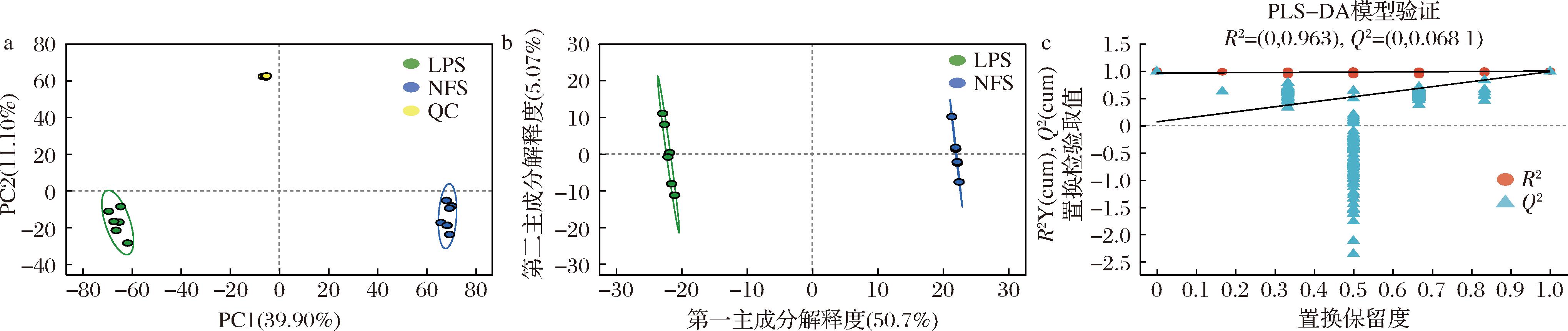 a-NFS、LPS和QC的PCA得分图;b-NFS和LPS代谢产物的PLS-DA得分图;c-NFS和LPS代谢产物的PLS-DA置换检验结果